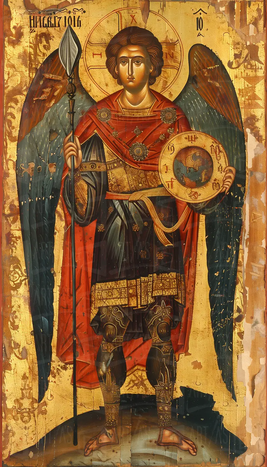 Icono del Arcángel Miguel con armadura y lanza, sosteniendo un escudo con el mundo.