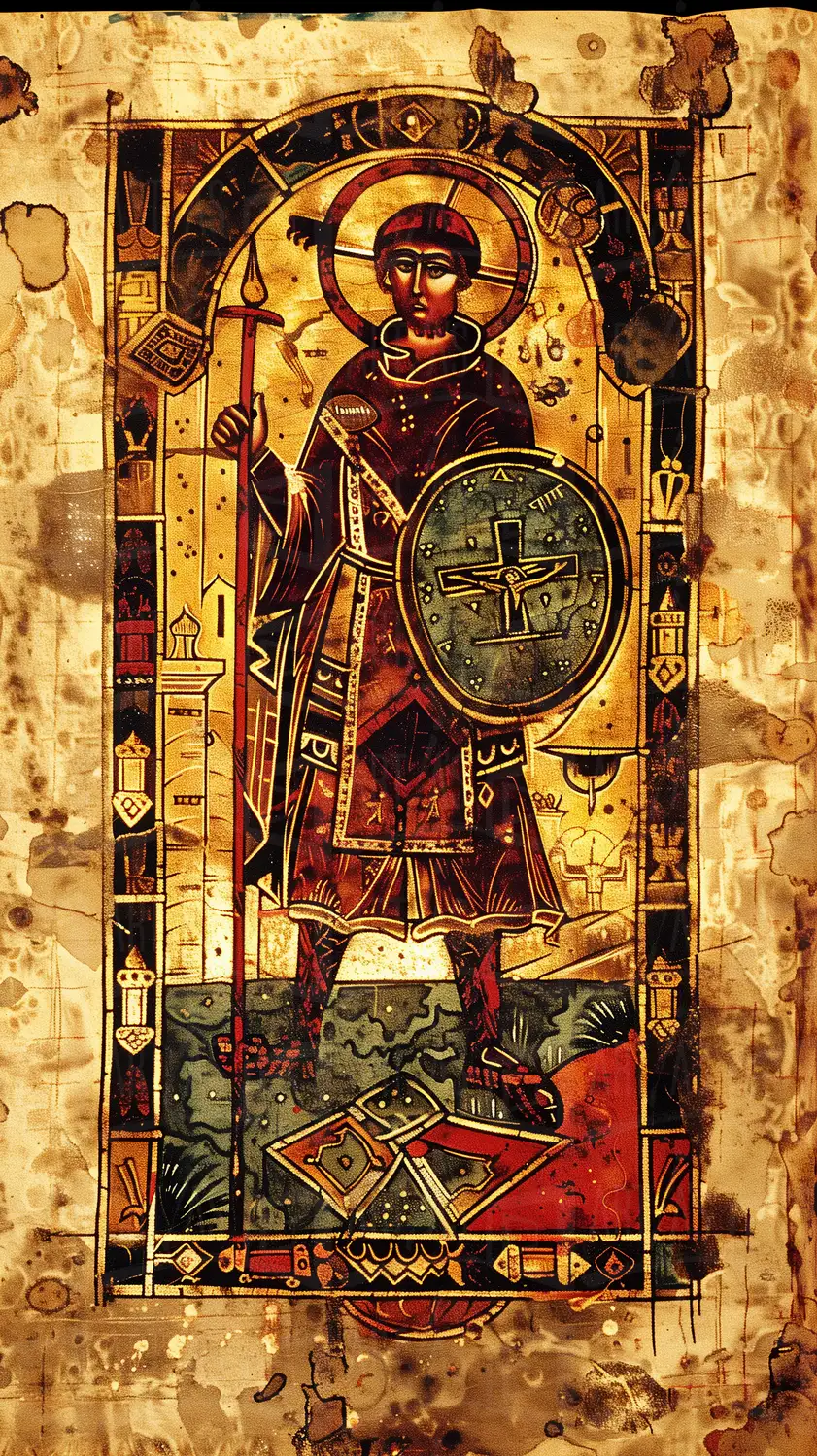 Icono religioso de un santo con armadura y escudo, sosteniendo una espada.