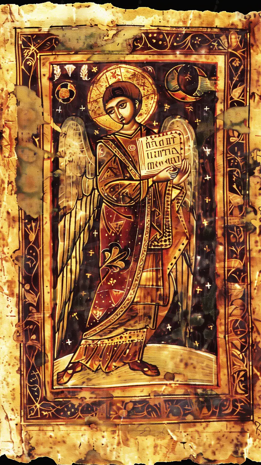 Icono de un ángel sosteniendo un libro con un fondo decorado.