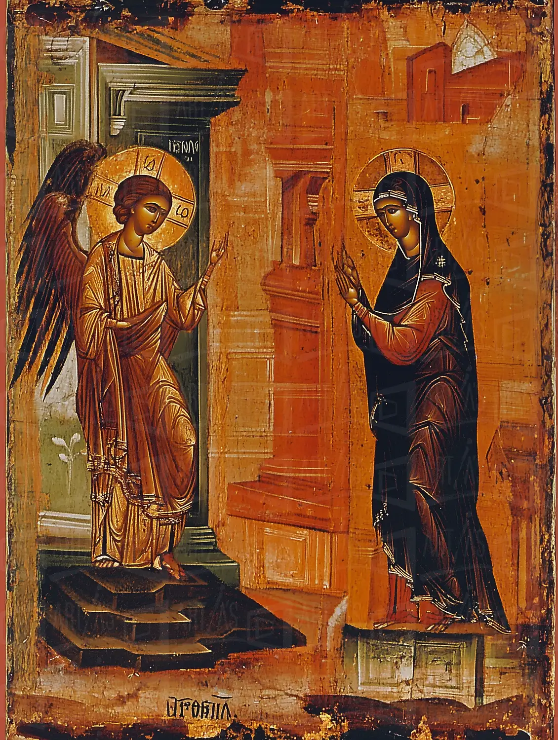 Icono religioso que representa la Anunciación con el arcángel Gabriel y la Virgen María.