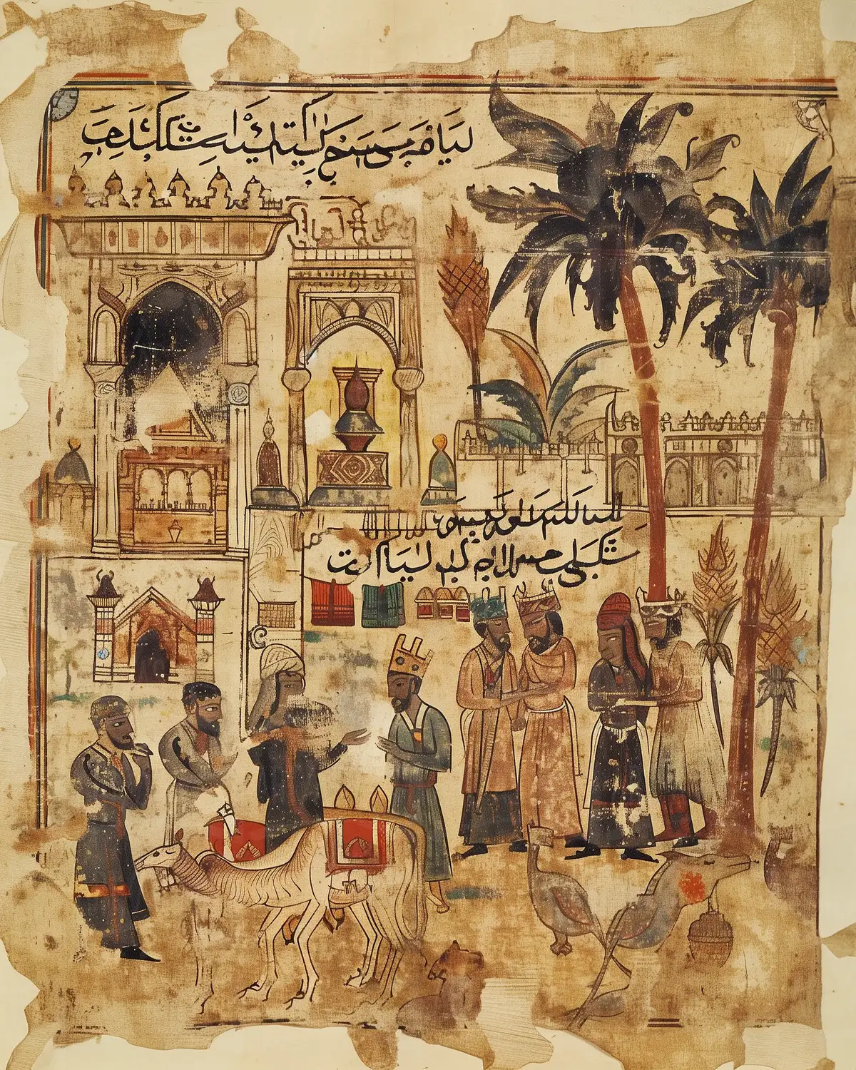 Representación de una escena histórica que muestra un grupo de figuras humanas en un entorno arquitectónico oriental. Se observa un camello en primer plano, junto a personajes que interactúan entre sí. La obra incluye elementos decorativos y vegetación, reflejando la cultura y el estilo de vida de la época. La técnica utilizada sugiere un enfoque detallado en la vestimenta y las expresiones de los personajes, destacando la importancia de la narrativa visual en la historia.