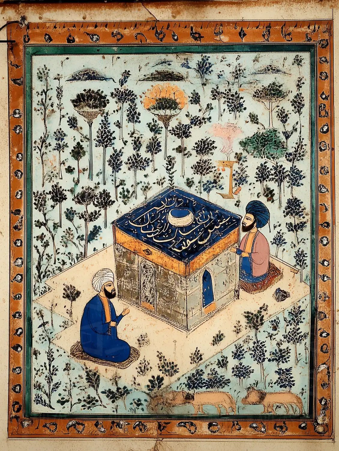Representación de dos figuras sentadas en oración ante una estructura que evoca un santuario, rodeadas de un paisaje con árboles estilizados y flores. La obra refleja la influencia del arte islámico, destacando la simetría y el uso de patrones decorativos. La paleta de colores incluye tonos azules y verdes, creando un ambiente sereno y espiritual. Esta obra se sitúa en el contexto del siglo XVI, caracterizada por su atención al detalle y la representación de la devoción religiosa.