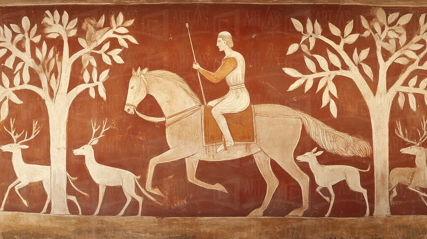 Representación de una escena de caza en la que un jinete montado en un caballo persigue ciervos en un entorno natural. La obra destaca por su uso de líneas simples y colores terrosos, creando un contraste entre el jinete, los animales y el fondo. Este fresco refleja la vida cotidiana y las actividades de caza en la antigüedad, mostrando la interacción entre el ser humano y la naturaleza. La técnica utilizada sugiere un enfoque narrativo, típico de las representaciones artísticas de épocas antiguas.