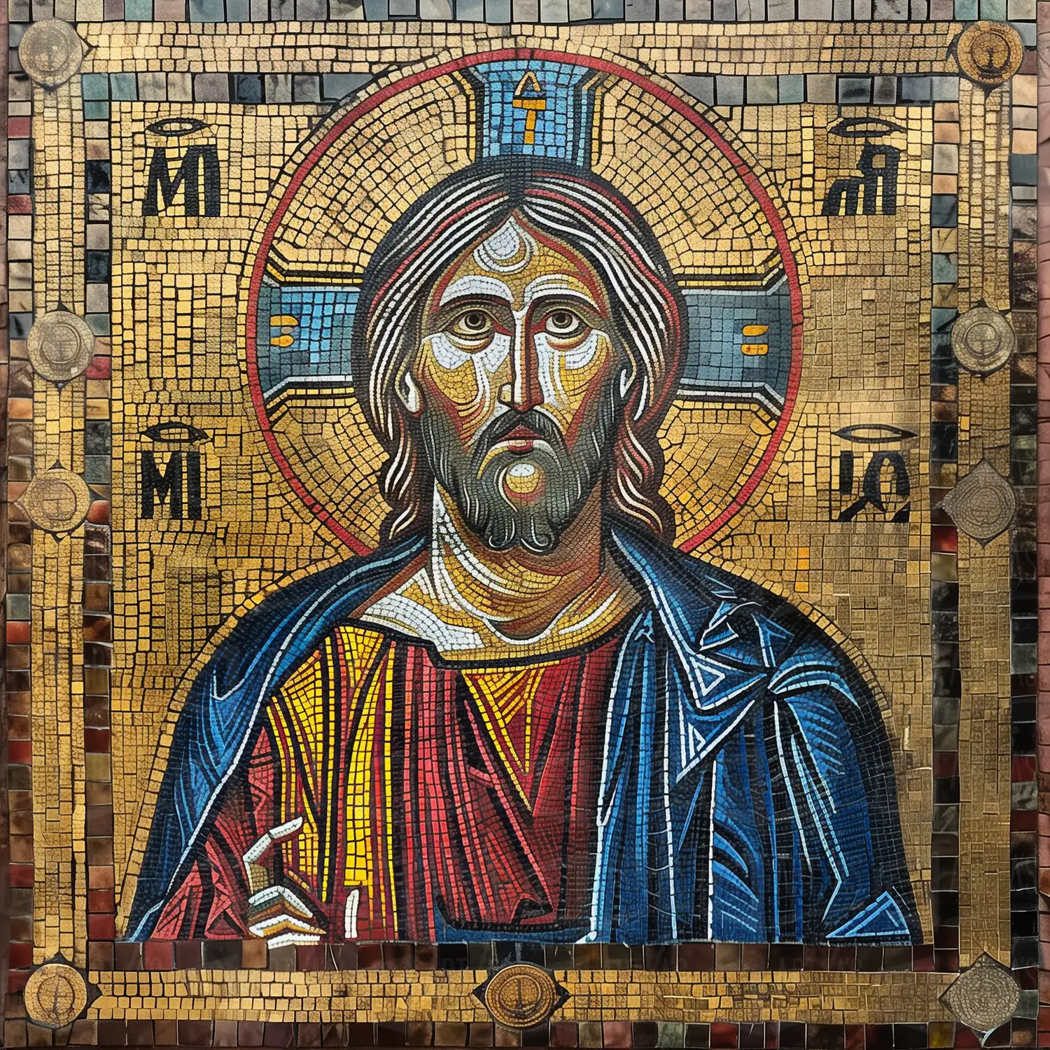 Icono religioso de Cristo con fondo dorado y detalles en mosaico.