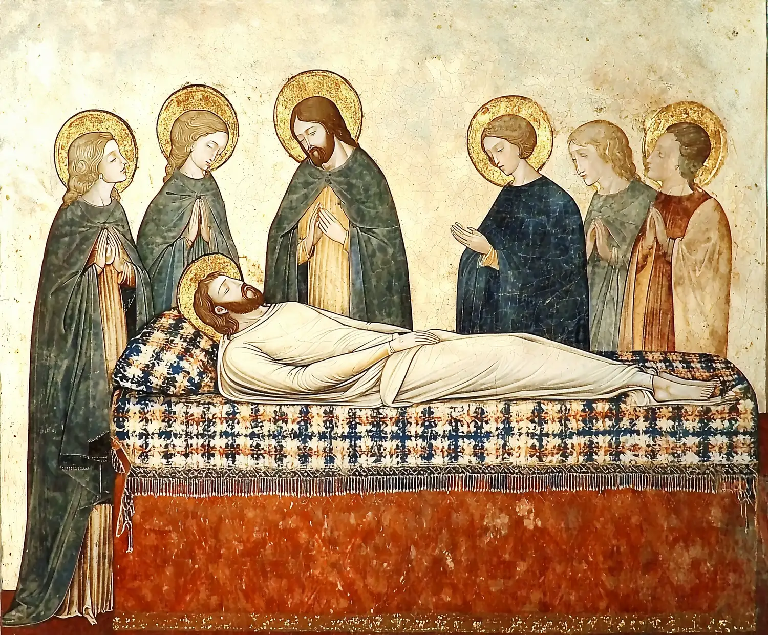 Representación de una escena religiosa donde varias figuras rodean un cuerpo en un lecho. Las figuras, con áureas doradas, muestran gestos de luto y devoción. La obra refleja el estilo del arte bizantino, caracterizado por la frontalidad y la falta de perspectiva. Los colores utilizados son sobrios, con predominancia de tonos oscuros y dorados, creando un ambiente solemne y reverente. Esta obra se sitúa en el contexto del arte religioso medieval, destacando la importancia de la espiritualidad en la época.