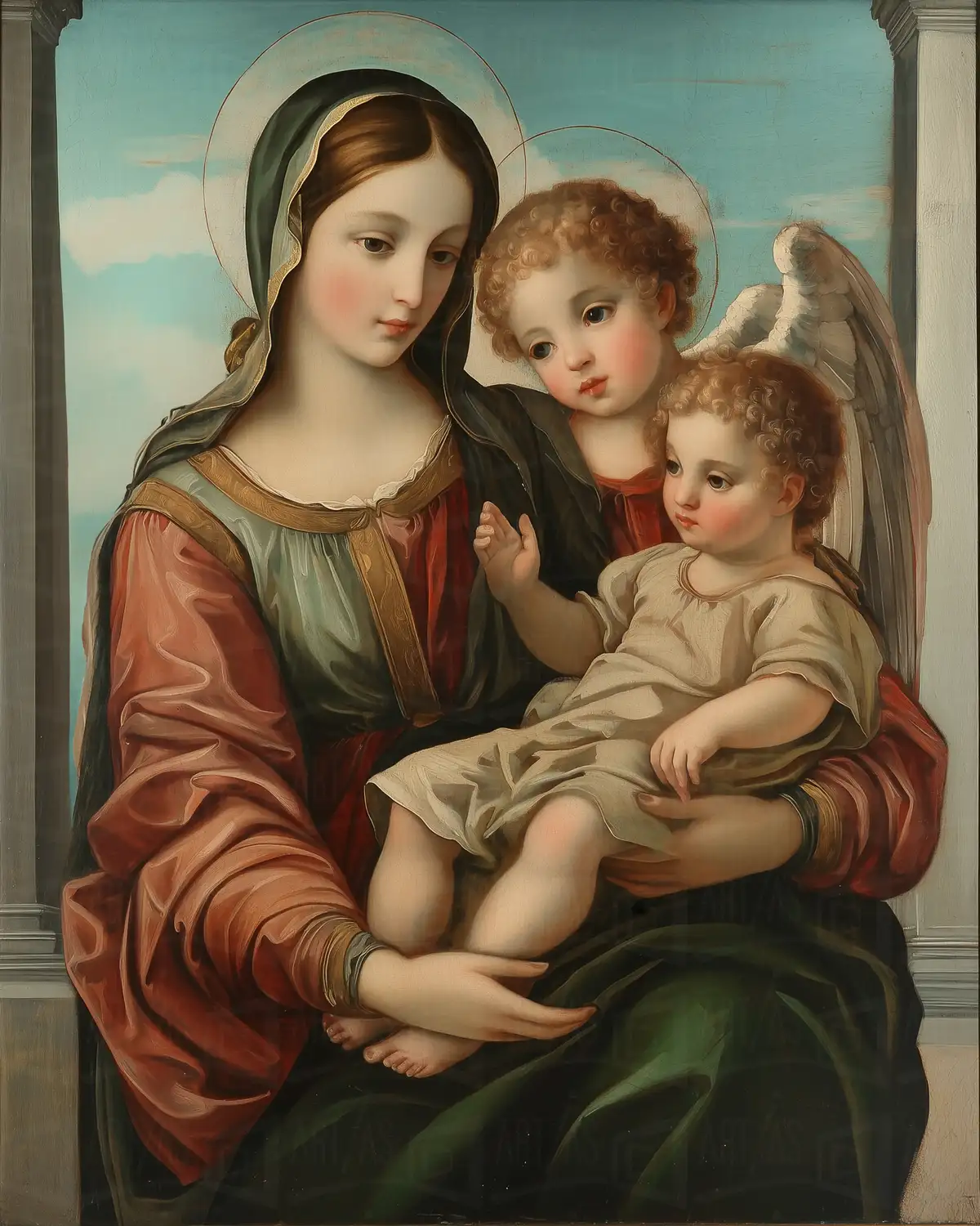 Retrato de la Virgen María, quien sostiene al niño Jesús en su regazo, acompañado por un ángel. La obra presenta un fondo sereno con nubes y un cielo azul, creando un ambiente de paz. La figura de la Virgen está vestida con ropas ricamente decoradas, mientras que los rostros de los niños muestran expresiones de ternura. Esta representación es típica del arte religioso del siglo XIX, destacando la devoción y la maternidad en la iconografía cristiana.