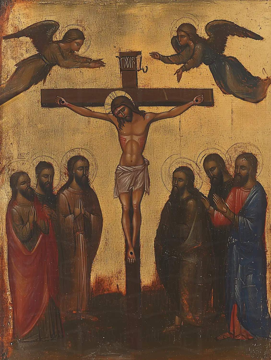 Representación de la crucifixión de Cristo, rodeado por ángeles y figuras religiosas que observan la escena. La obra destaca por su uso del dorado en el fondo, creando un ambiente celestial. Los rostros de los personajes reflejan una profunda emoción, mientras que la figura central de Cristo muestra un fuerte simbolismo religioso. Esta obra se sitúa en el contexto del arte bizantino, caracterizada por su estilo icónico y su enfoque en la espiritualidad.