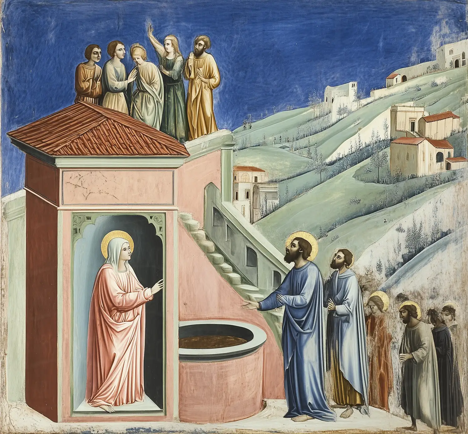 Representación de una escena religiosa en un paisaje montañoso. En el primer plano, una mujer aparece en un nicho, mientras que varias figuras se agrupan en la parte superior de la obra. La composición muestra un uso equilibrado de la arquitectura y el entorno natural, con un cielo azul que contrasta con los tonos suaves de las vestimentas. Esta obra refleja la estética del Renacimiento, destacando la interacción entre lo divino y lo humano.