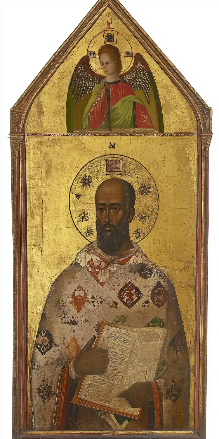Icono religioso que presenta a un santo sosteniendo un libro, con un ángel en la parte superior. La obra destaca por su uso del dorado en el fondo, que resalta la figura del santo y el ángel. La representación es típica de la pintura bizantina, donde se busca transmitir espiritualidad y solemnidad. Los detalles en las vestimentas y los rostros reflejan la técnica de la época, caracterizada por la frontalidad y la falta de perspectiva tridimensional.