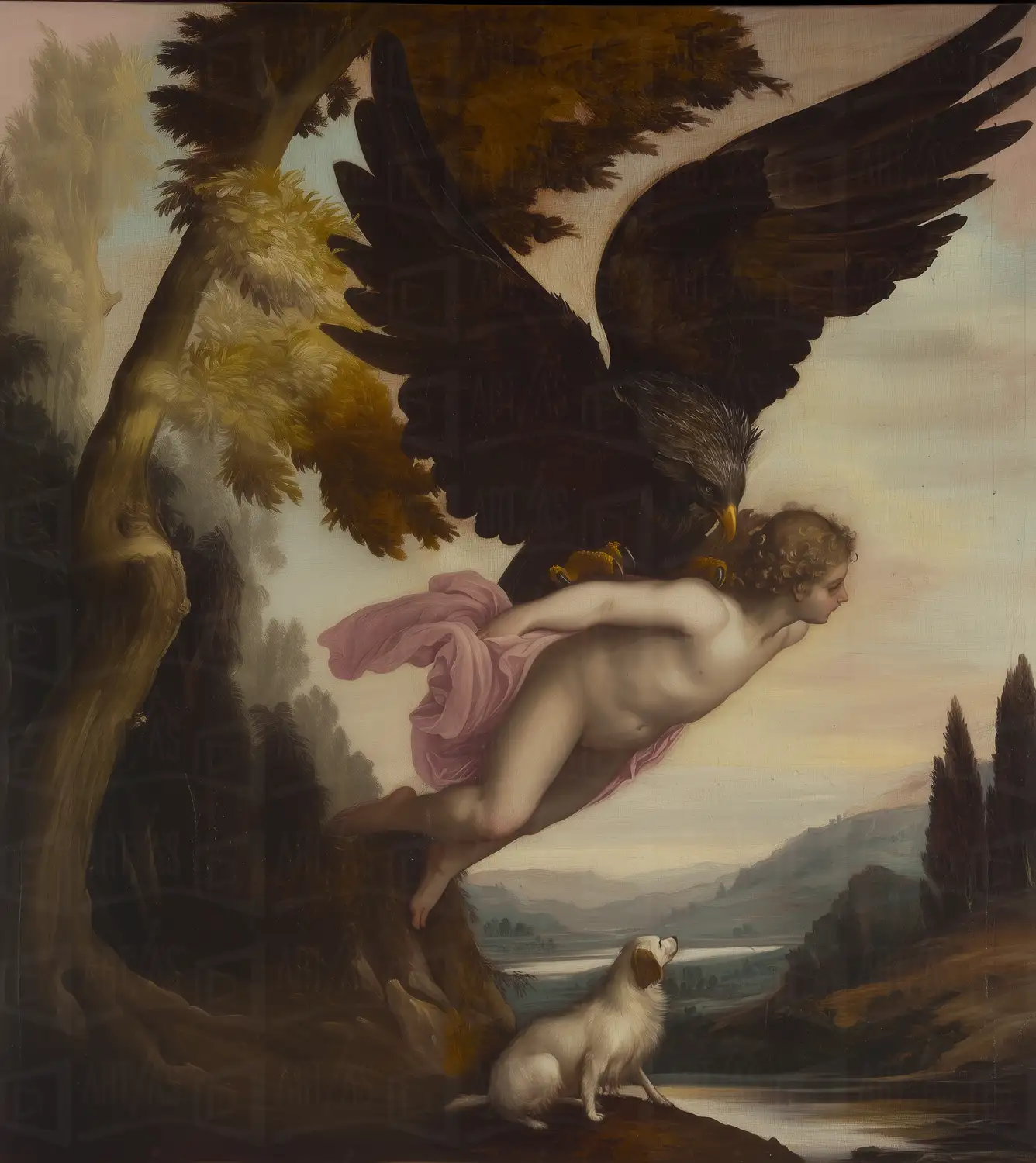 Representación de una escena mitológica donde un joven es llevado por un águila, simbolizando la conexión entre lo divino y lo humano. El fondo presenta un paisaje sereno con árboles y un río, mientras un perro observa la acción desde el suelo. La obra utiliza una paleta de colores suaves y una técnica detallada que resalta la anatomía del joven y la majestuosidad del águila, evocando temas de amor y protección en la mitología clásica.