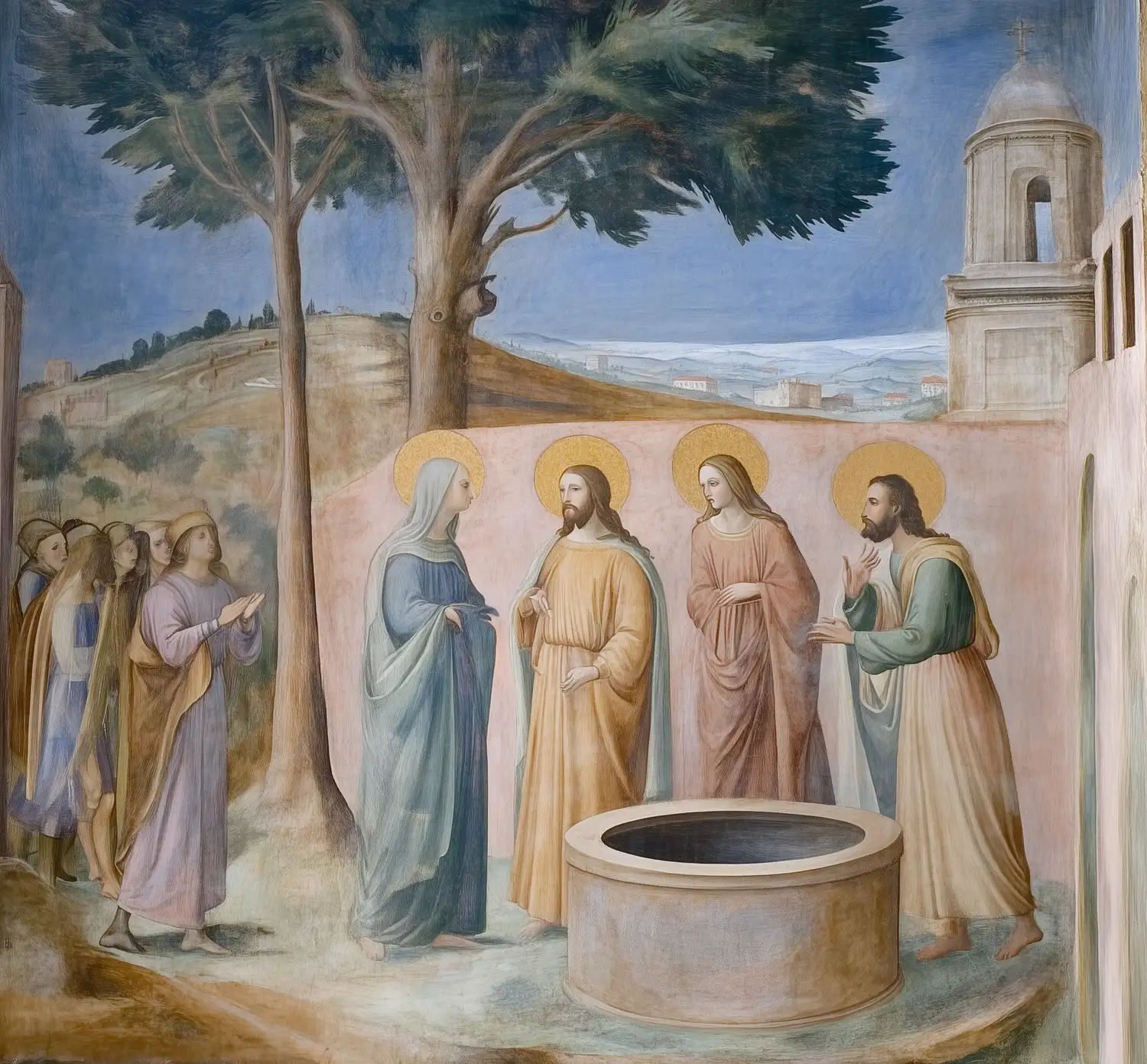 Representación de una escena religiosa que incluye a varias figuras de santos, destacando un pozo en el centro. Los personajes están rodeados de un paisaje que sugiere un entorno rural. La obra utiliza colores suaves y una composición equilibrada, con un fondo que muestra colinas y un cielo claro. La disposición de las figuras y el uso de halos dorados enfatizan la sacralidad de la escena, típica del arte religioso del Renacimiento.