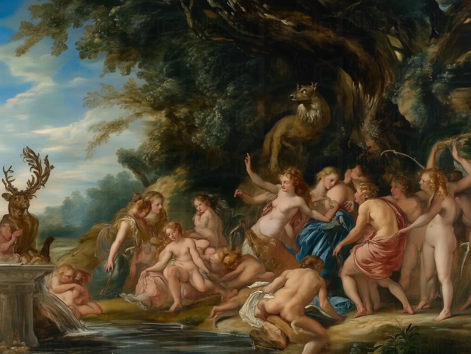 Obra que representa una escena mitológica con varias figuras desnudas en un entorno natural. Las figuras, tanto masculinas como femeninas, interactúan en un ambiente de armonía y belleza. El fondo está compuesto por árboles frondosos y un cuerpo de agua, creando un contraste entre la luz y la sombra. La obra refleja la influencia del Barroco, destacando el movimiento y la expresión emocional de los personajes, así como la riqueza de los detalles en la vestimenta y el paisaje.