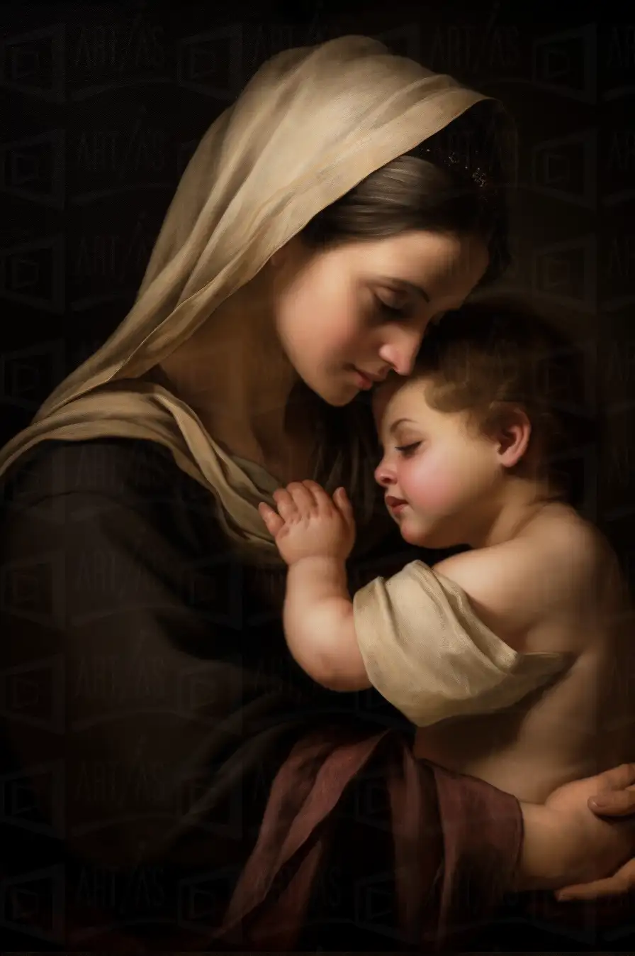 Retrato de una madre sosteniendo a su hijo en un ambiente sombrío, donde la luz resalta las expresiones de ternura y conexión entre ambos. La obra utiliza un contraste fuerte entre la luz y la sombra, creando un efecto dramático que enfatiza la intimidad del momento. La técnica empleada sugiere un estilo clásico, característico de la pintura del siglo XVII, donde se busca transmitir emociones profundas a través de la representación de figuras humanas.