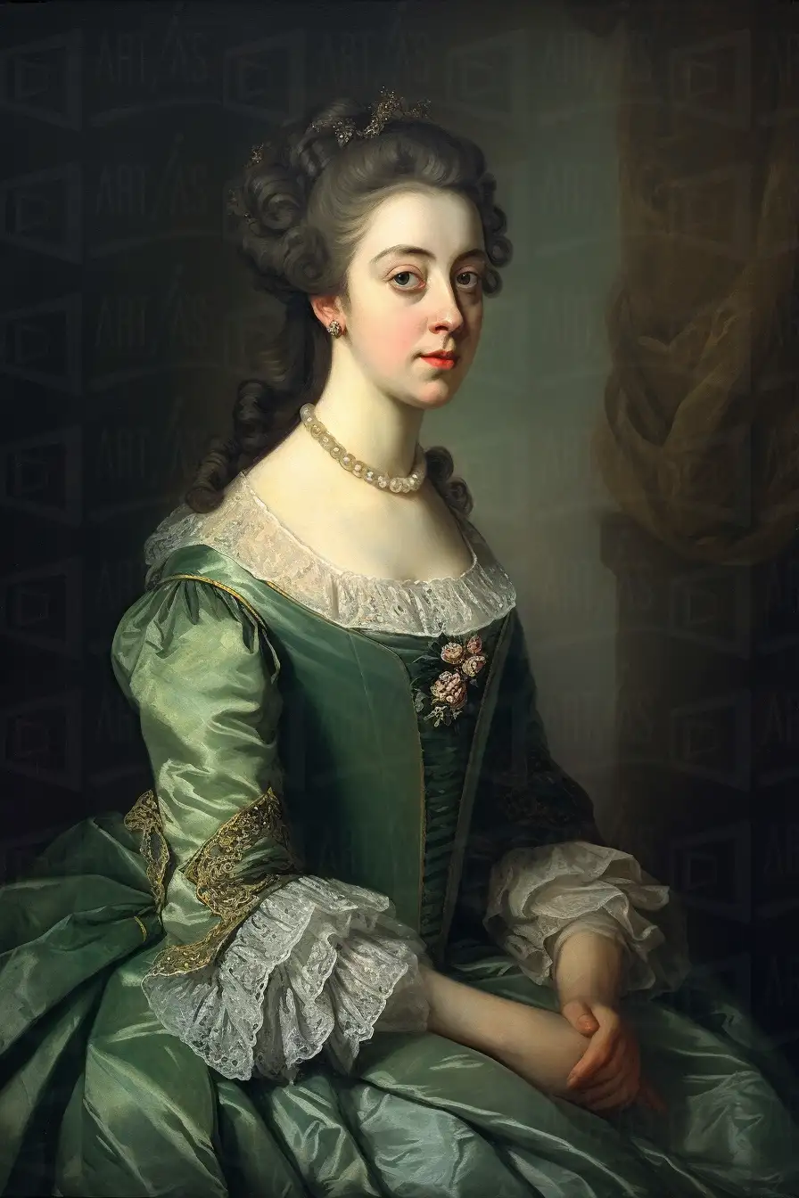 Retrato de una mujer vestida con un elegante vestido verde, adornado con detalles en encaje y joyas. Su cabello está cuidadosamente peinado, y lleva un collar de perlas. La obra refleja la moda del siglo XVIII, destacando la atención al detalle en la vestimenta y la expresión del rostro. La iluminación suave resalta las características faciales y la textura del vestido, creando un ambiente de sofisticación y elegancia.