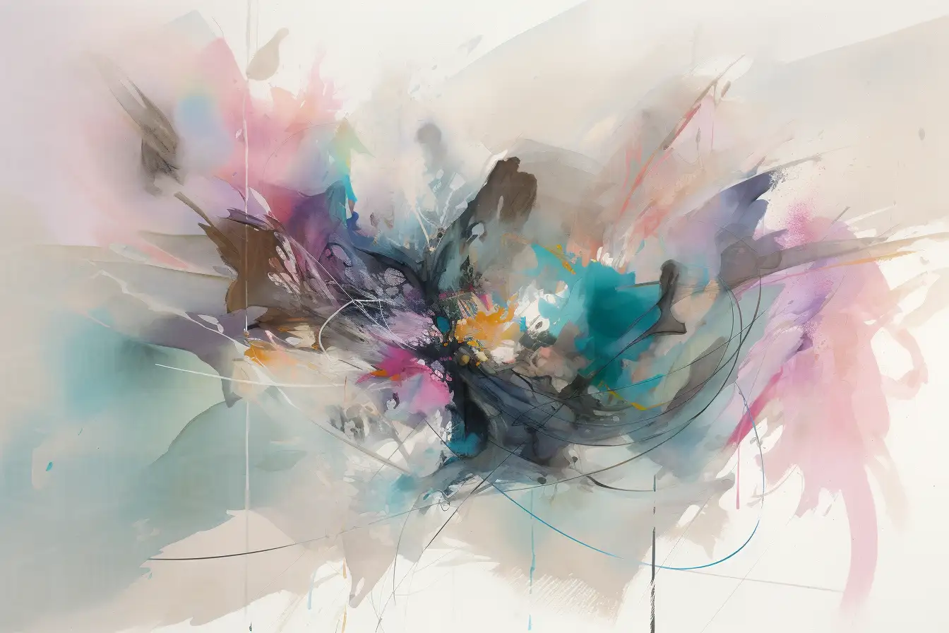 Obra abstracta que presenta una composición dinámica con formas fluidas y una mezcla de colores vibrantes. La interacción de tonos azules, rosas y grises crea un efecto visual atractivo, sugiriendo movimiento y energía. Esta obra destaca por su técnica de aplicación de color, que permite una fusión armoniosa de los elementos, invitando al espectador a una interpretación personal de la experiencia visual.