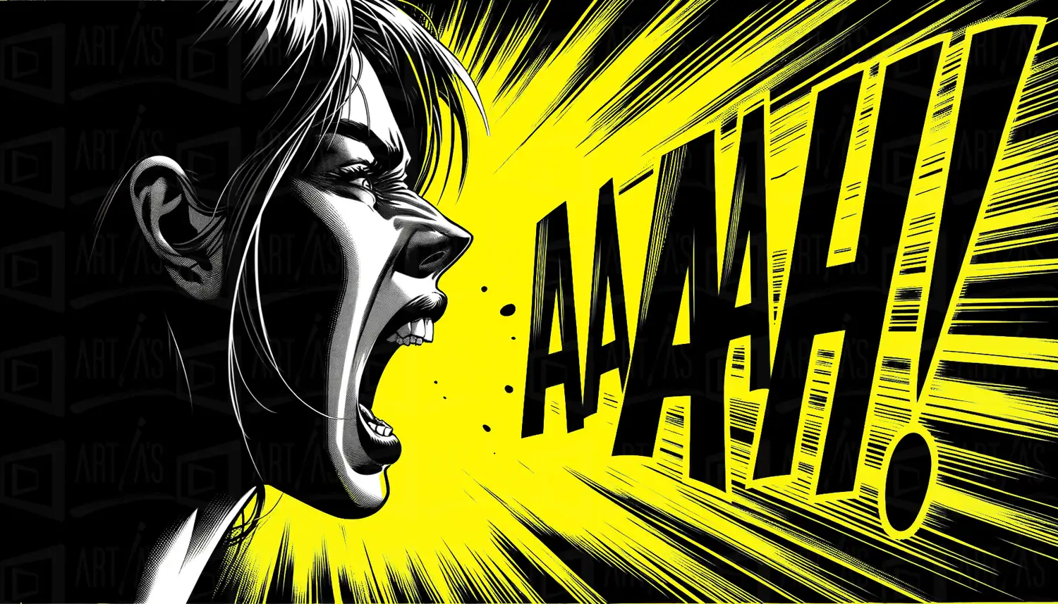 Ilustración de una mujer gritando con fondo amarillo y líneas de acción.