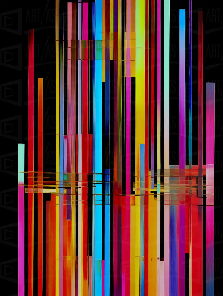 Obra abstracta que presenta una serie de líneas verticales en una variedad de colores brillantes, dispuestas sobre un fondo negro. La disposición de los colores crea un efecto dinámico y enérgico, invitando al espectador a explorar la interacción entre las formas y los tonos. Esta obra destaca por su uso del color y la forma, representando una expresión contemporánea del arte abstracto.