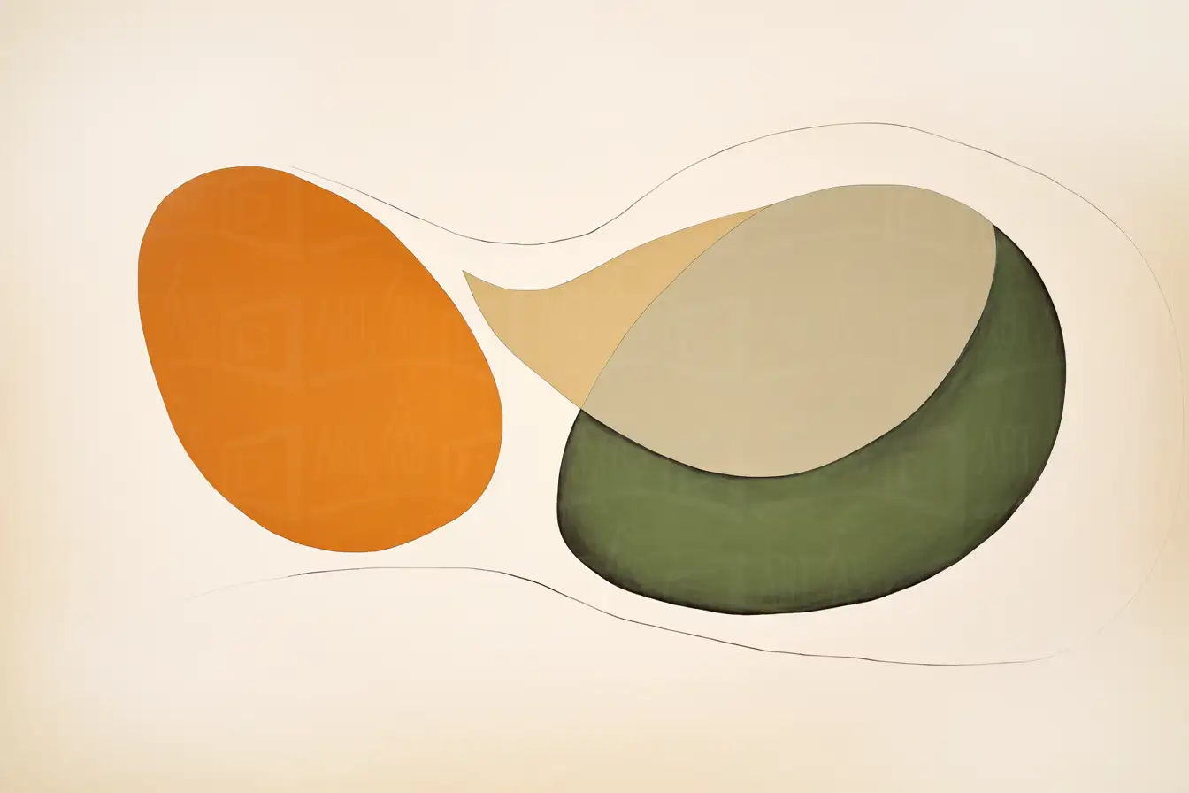 Obra abstracta que presenta una disposición de formas orgánicas en colores naranja, verde y beige sobre un fondo claro. Las formas se entrelazan suavemente, creando un diálogo visual que invita a la contemplación. La simplicidad de la paleta de colores y la fluidez de las líneas aportan una sensación de armonía y equilibrio, destacando la interacción entre los diferentes elementos. Esta obra es un ejemplo del arte contemporáneo que explora la relación entre color y forma.