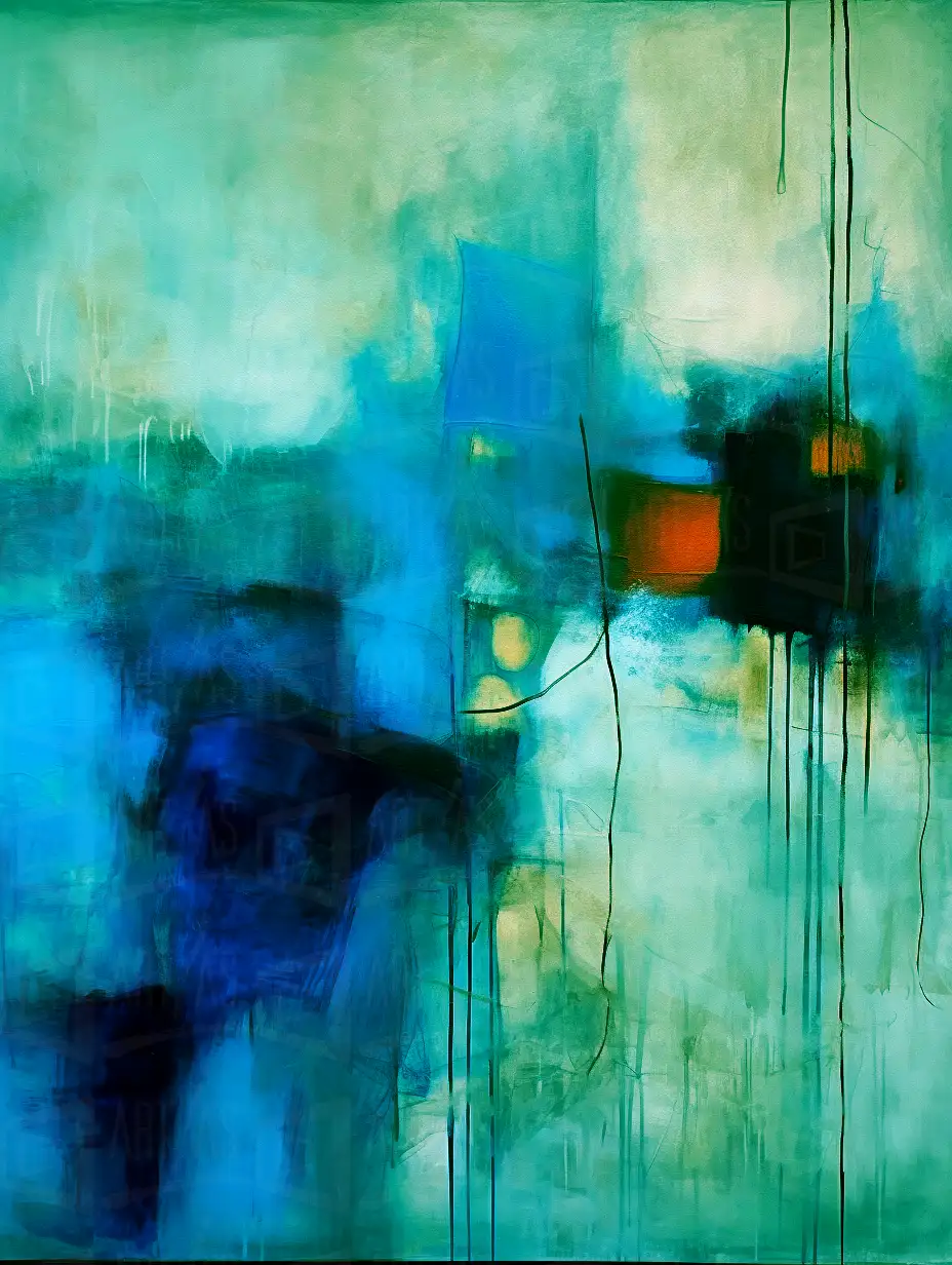 Obra abstracta que presenta una mezcla de tonos azules y verdes, con toques de naranja que aportan un contraste visual. La disposición de los colores y las formas sugiere una atmósfera fluida y dinámica, invitando a la interpretación personal. Esta obra destaca por su uso del color y la técnica, creando un efecto visual que capta la atención del espectador y lo sumerge en un mundo de sensaciones.
