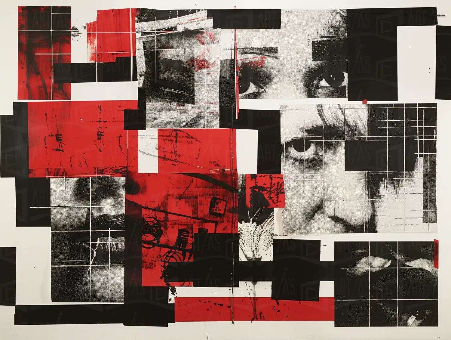 Obra abstracta que presenta una composición dinámica con rostros humanos fragmentados y formas geométricas. Los tonos predominantes son el rojo, negro y blanco, creando un contraste visual fuerte. La disposición de los elementos sugiere una interacción entre la figura y el fondo, invitando al espectador a explorar las emociones y la identidad a través de la fragmentación. Esta obra refleja la complejidad de la percepción humana en un contexto contemporáneo.