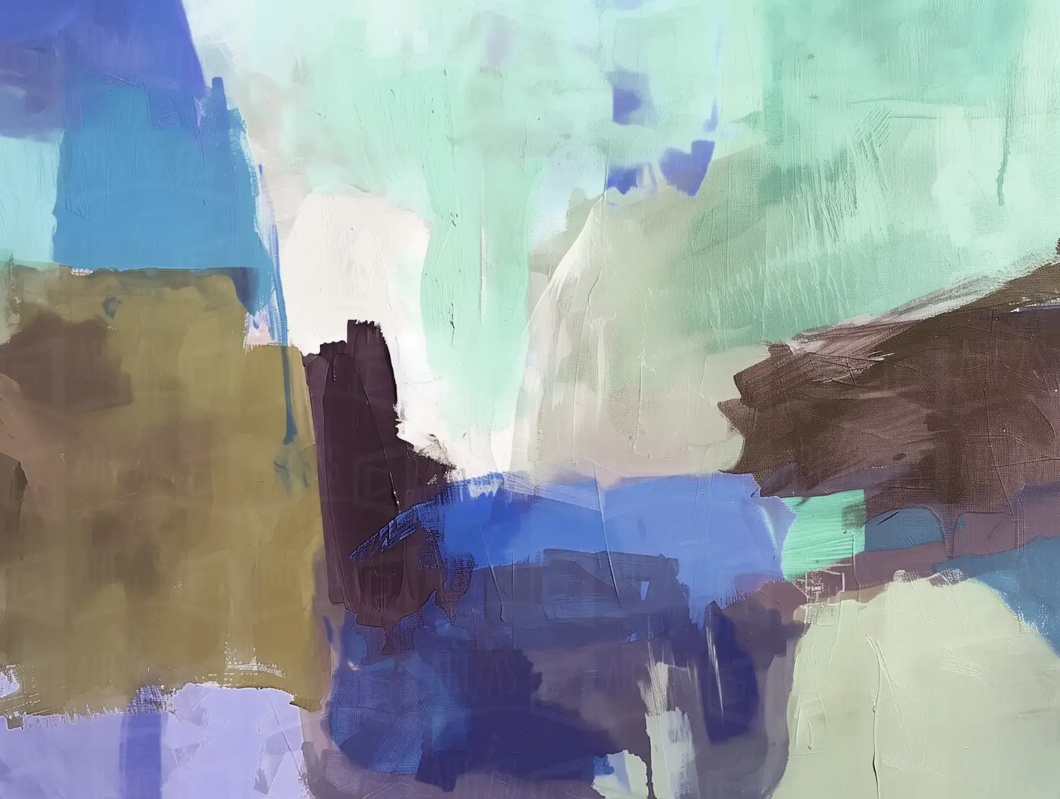 Composición abstracta con formas y colores en tonos azules, verdes y marrones.