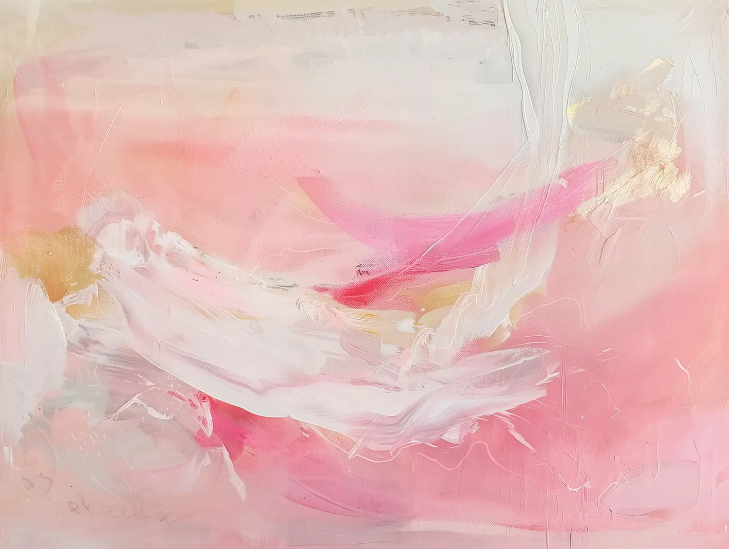 Obra abstracta que presenta una mezcla de tonos suaves, predominando el rosa y el blanco. Las pinceladas se disponen de manera fluida, creando un efecto de movimiento y ligereza. La obra evoca una sensación de calma y serenidad, con una paleta que invita a la contemplación. La interacción de los colores y las formas sugiere un paisaje emocional, donde la simplicidad se convierte en un medio de expresión profunda.