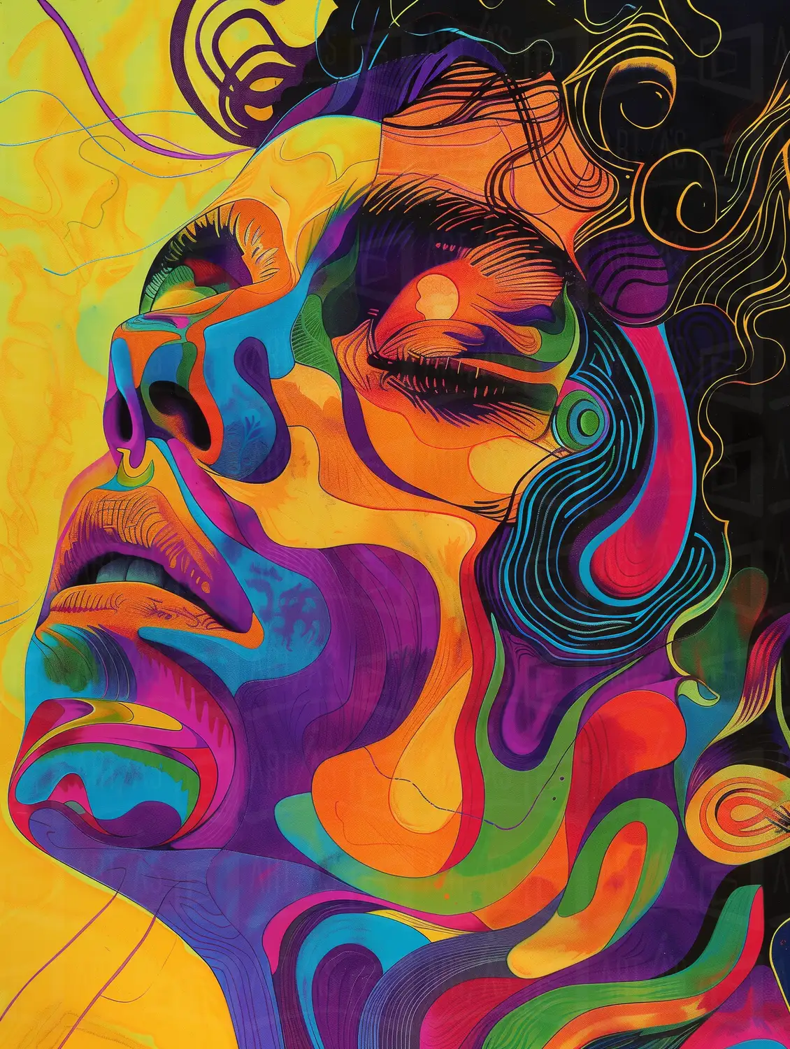 Retrato abstracto de una figura humana con colores vibrantes y formas fluidas.