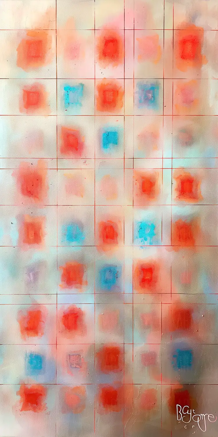 Obra abstracta que presenta una serie de formas cuadradas dispuestas en un patrón regular. Los colores predominantes incluyen tonos cálidos como el rojo y el naranja, junto con tonos fríos como el azul. La disposición de los elementos crea un ritmo visual que invita a la contemplación. La obra utiliza una técnica de difuminado que suaviza los bordes de las formas, generando una sensación de movimiento y fluidez. Esta pieza es un ejemplo de la exploración contemporánea de la abstracción y el color.