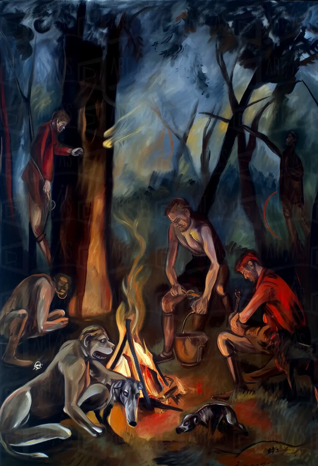 Obra que representa una escena nocturna en un bosque, donde un grupo de personas se reúne alrededor de una fogata. La luz del fuego ilumina sus rostros y el entorno, creando un contraste entre la calidez del fuego y la oscuridad del bosque. Los personajes realizan diversas actividades, mientras que varios perros están presentes en la escena, añadiendo un elemento de vida y compañía. La composición destaca la interacción humana con la naturaleza y el uso del fuego como fuente de luz y calor.