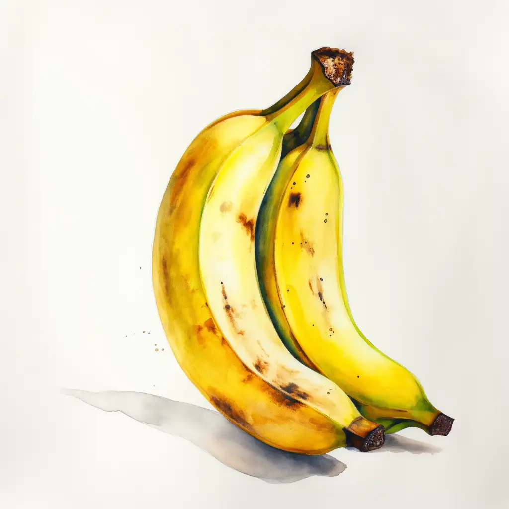 Obra que representa tres plátanos en una disposición natural sobre un fondo blanco. Los plátanos muestran diferentes tonalidades de amarillo, con algunas manchas marrones que indican madurez. La luz resalta la forma y la textura de la fruta, creando un contraste visual con el fondo. Esta representación destaca la simplicidad y la belleza de la naturaleza a través de un enfoque realista.