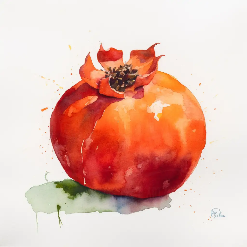 Obra que representa una granada en primer plano, destacando su forma redonda y los detalles de su corona. El uso de acuarela permite una transición suave entre los colores, con salpicaduras que añaden dinamismo. El fondo es sutil, lo que resalta la fruta como el elemento central. Esta obra captura la esencia de la naturaleza a través de una técnica que enfatiza la luminosidad y la frescura de la granada.
