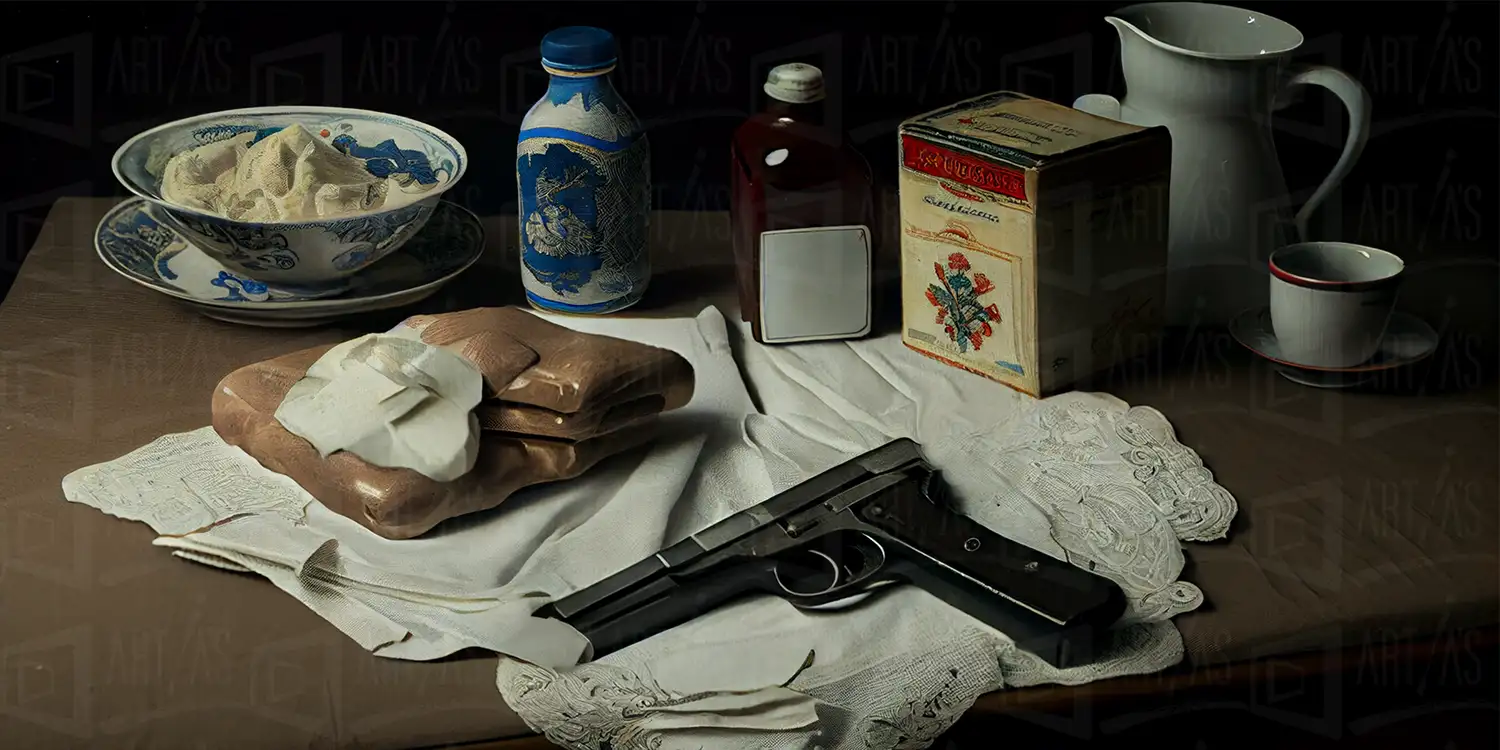 La obra representa una naturaleza muerta que incluye varios objetos cotidianos dispuestos sobre una mesa. Se observan un arma, botellas, un plato decorado, un recipiente y un paño. La disposición de los elementos crea un contraste entre lo cotidiano y lo inesperado, sugiriendo una narrativa que invita a la reflexión sobre la relación entre los objetos y su significado en la vida diaria. La iluminación suave resalta las texturas y formas de cada objeto, creando un ambiente introspectivo.