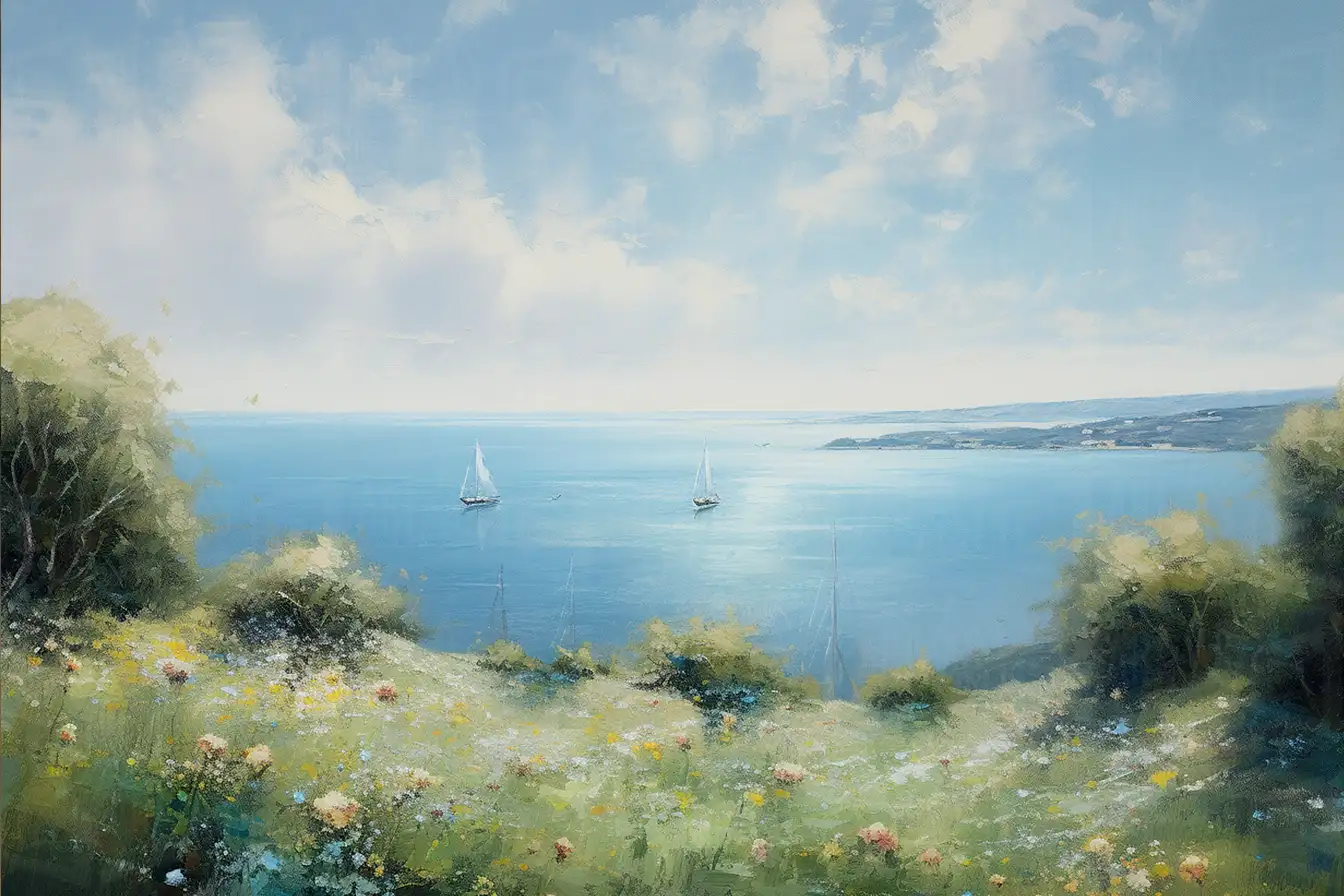 Obra que representa un paisaje marino donde se observan dos barcos de vela navegando en aguas tranquilas. El cielo azul claro se mezcla con nubes suaves, mientras que la vegetación en primer plano añade un toque de color con flores silvestres. Esta composición destaca la armonía entre el mar y la naturaleza, creando una atmósfera serena y relajante, ideal para apreciar la belleza del entorno costero.