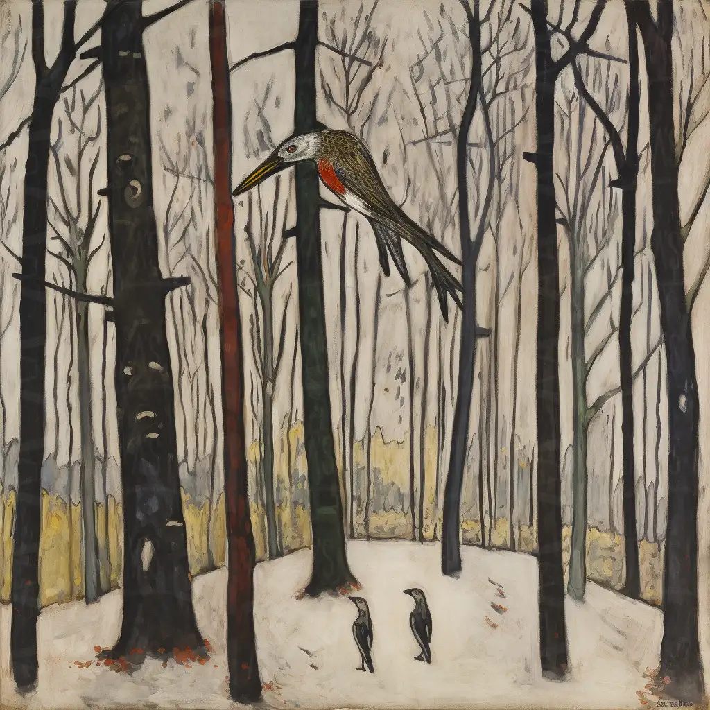 Obra que representa un bosque en un ambiente invernal, donde un pájaro grande vuela sobre el paisaje. Los árboles, despojados de hojas, se alzan en un entorno nevado. En el suelo, dos aves se encuentran, creando un contraste entre la vida y la quietud del paisaje. La paleta de colores fríos y la disposición de los elementos transmiten una sensación de soledad y reflexión en la naturaleza.