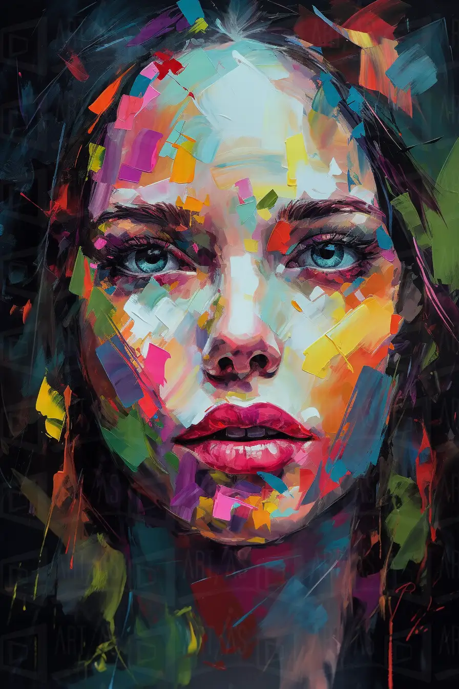 Obra que representa un retrato abstracto de una mujer, donde se utilizan colores vibrantes y formas geométricas para crear una imagen impactante. La composición destaca por su uso audaz del color y la textura, capturando la esencia del sujeto de manera no convencional. Los elementos visuales se combinan para transmitir una sensación de energía y dinamismo, invitando al espectador a explorar la profundidad emocional de la figura representada.