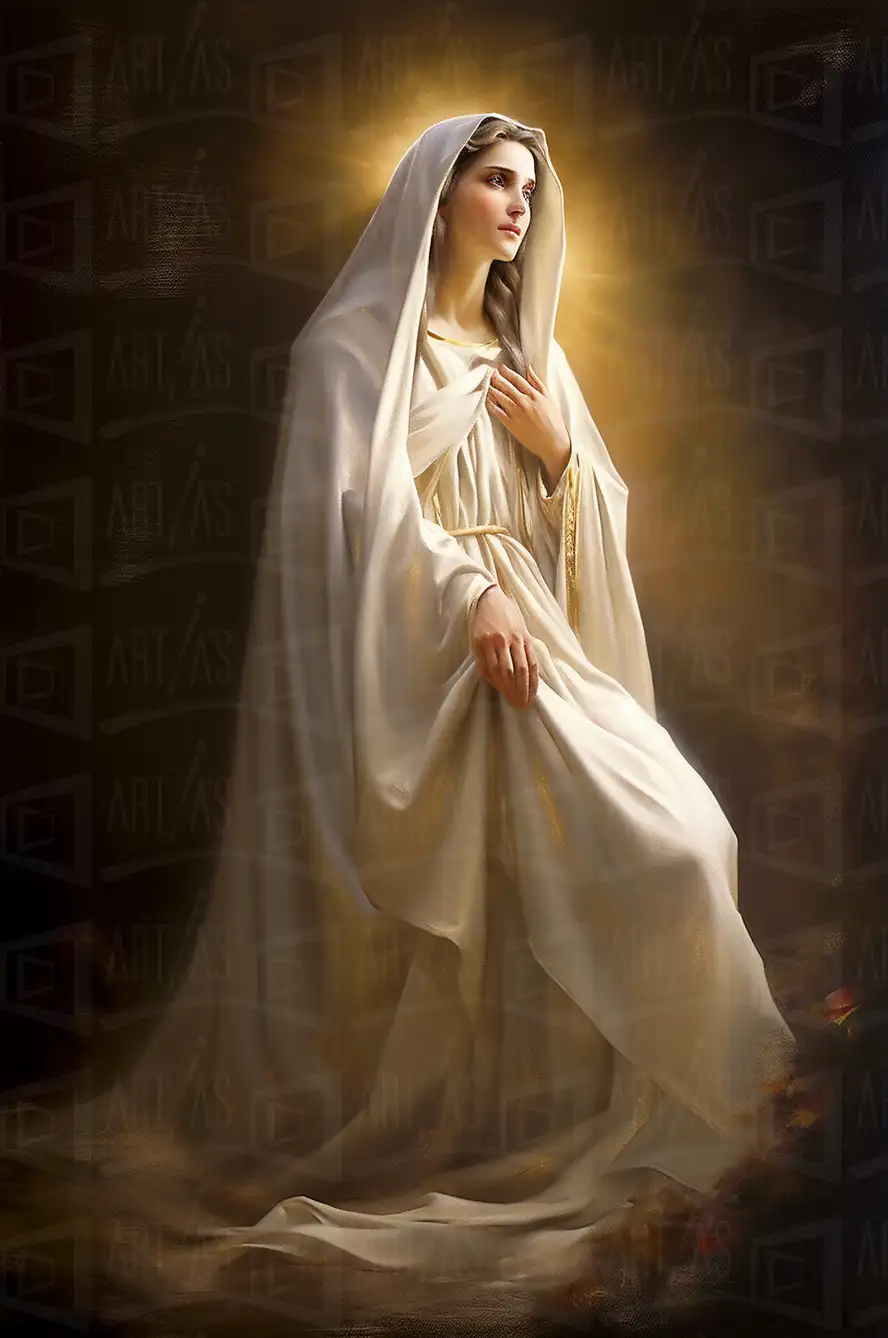 Obra que representa a una figura femenina vestida con un manto blanco, destacando su rostro sereno y expresivo. La iluminación resalta la figura en un fondo oscuro, creando un contraste que enfatiza la delicadeza de la vestimenta y la expresión del rostro. Esta representación evoca una sensación de paz y espiritualidad, siendo un ejemplo notable de la iconografía religiosa.
