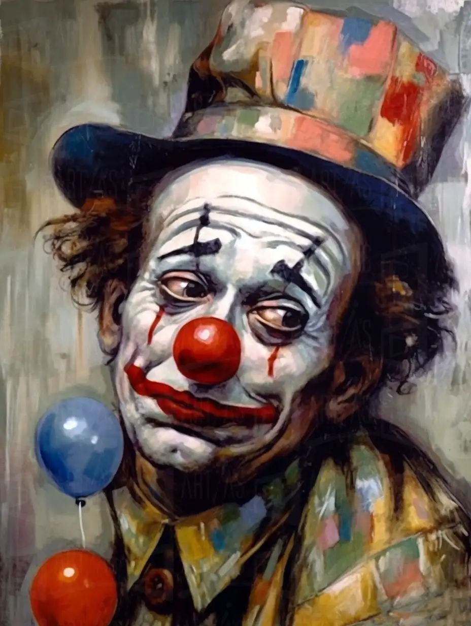 Retrato de un payaso que muestra su expresión característica, con un maquillaje blanco y detalles en rojo y negro. El payaso sostiene globos de colores, que añaden un elemento festivo a la obra. La composición resalta la dualidad entre la alegría y la melancolía, capturando la esencia del personaje. La técnica utilizada permite apreciar los detalles del rostro y la vestimenta, creando un impacto visual que invita a la reflexión sobre la figura del payaso en la cultura popular.