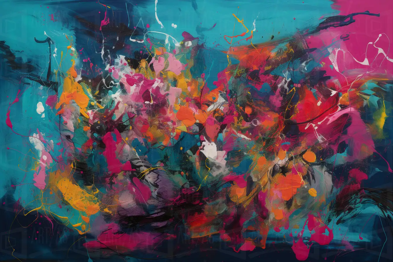 Obra abstracta que presenta una explosión de colores vibrantes y formas fluidas. La interacción de tonos como el azul, rosa, naranja y amarillo crea un efecto visual enérgico y dinámico. Las líneas y manchas de pintura se entrelazan, generando un sentido de movimiento y profundidad. Esta obra invita a la interpretación personal, destacando la libertad creativa del artista y su capacidad para evocar emociones a través del color y la forma.