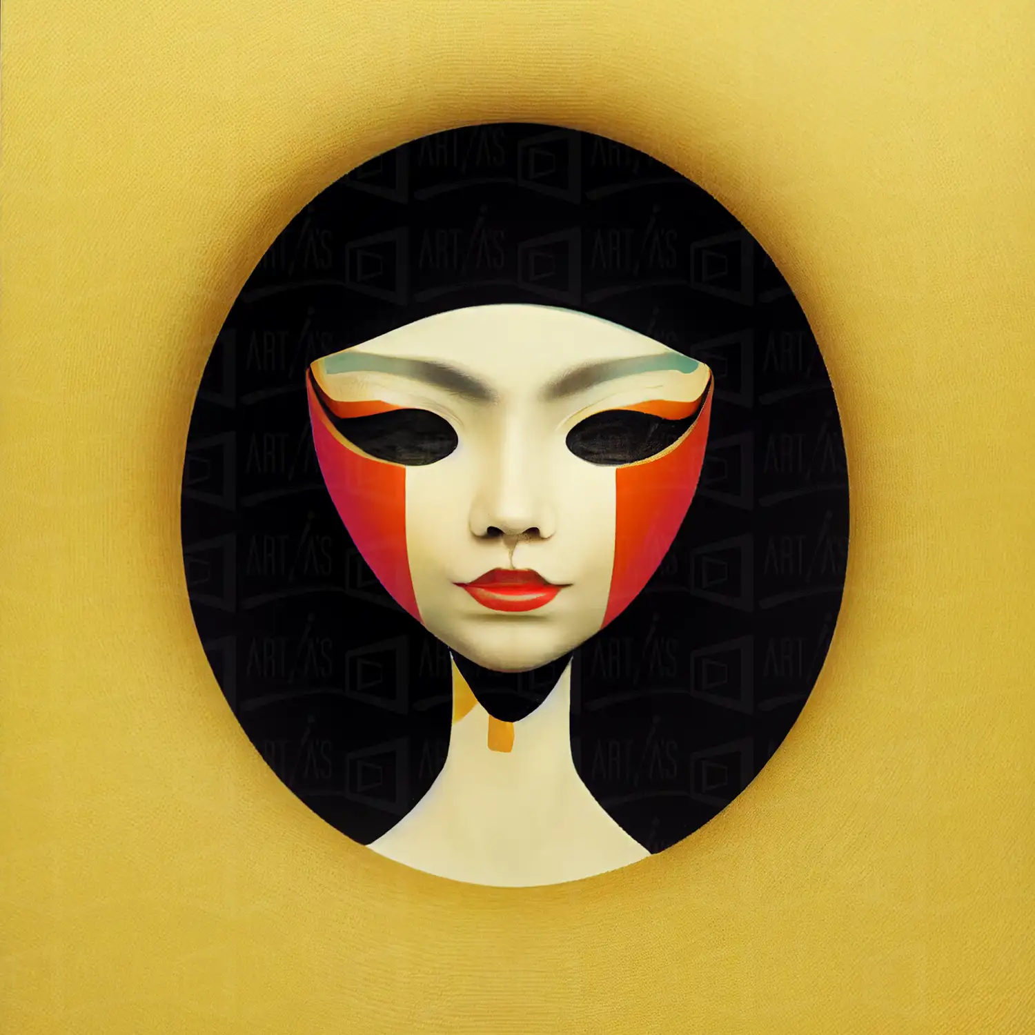 Obra que presenta un retrato estilizado de una figura femenina, destacando un rostro con rasgos geométricos y colores vibrantes. La figura tiene un fondo amarillo que resalta su presencia, mientras que los detalles en la cara incluyen tonos de rojo, negro y naranja. Esta representación juega con la simetría y el contraste, creando un impacto visual que invita a la reflexión sobre la identidad y la estética contemporánea.
