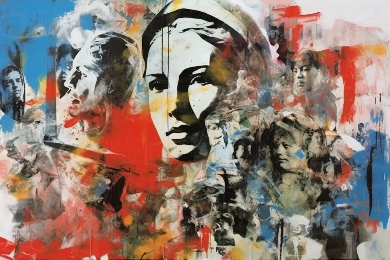 Obra que presenta una composición abstracta con múltiples rostros humanos superpuestos, utilizando una paleta de colores vibrantes como rojo, azul y negro. La disposición de los rostros crea una sensación de movimiento y dinamismo, mientras que las manchas de color aportan una atmósfera contemporánea. Esta obra refleja la complejidad de la identidad humana a través de la fusión de formas y colores, invitando a la reflexión sobre la percepción y la memoria.