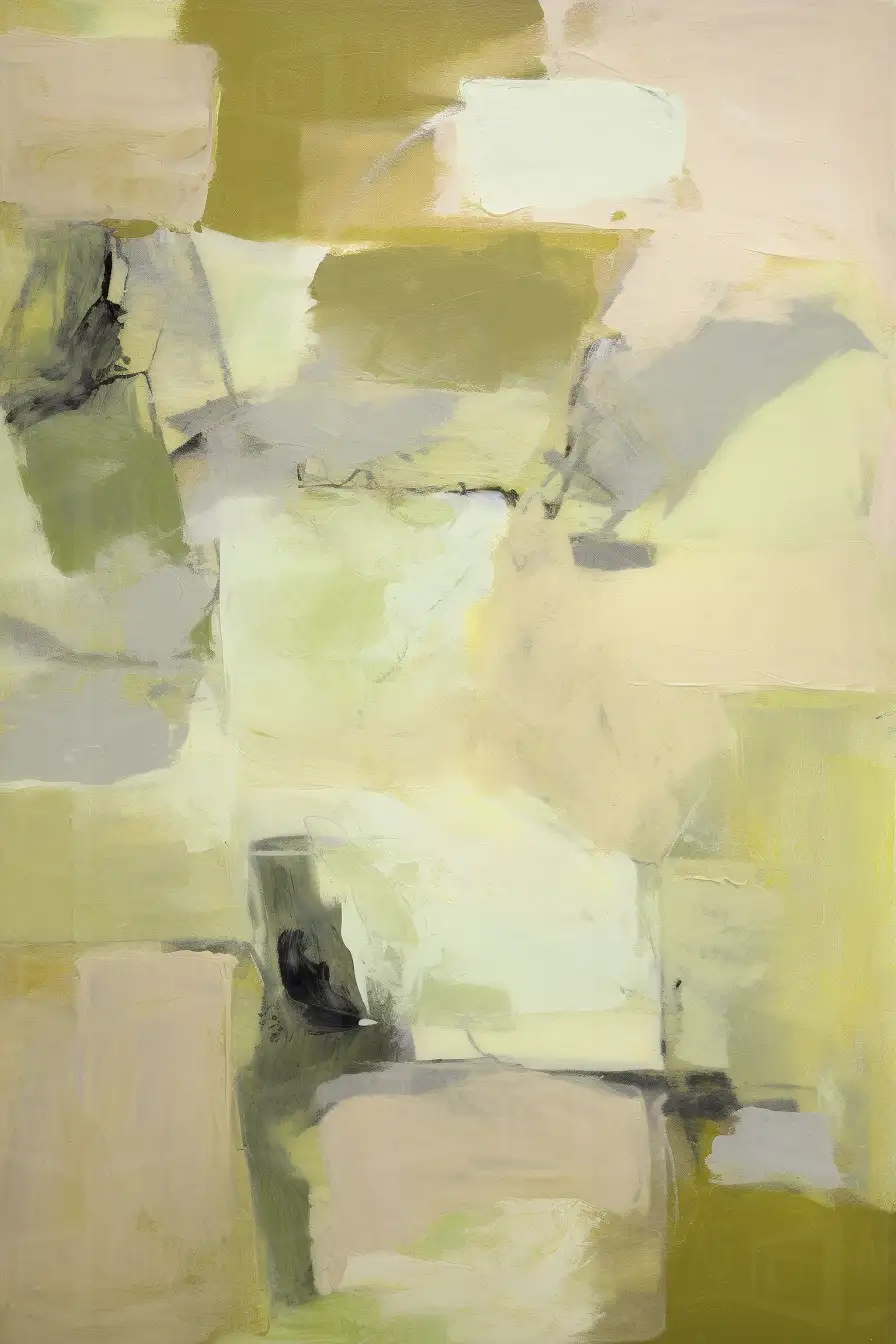 Obra abstracta que presenta una disposición de formas geométricas en tonos suaves de verde y beige. La interacción de los colores crea un efecto visual que invita a la contemplación. Las áreas de color se superponen y se combinan, generando un sentido de profundidad y movimiento. Esta obra refleja la exploración de la forma y el color en un contexto contemporáneo, destacando la simplicidad y la elegancia de la abstracción.