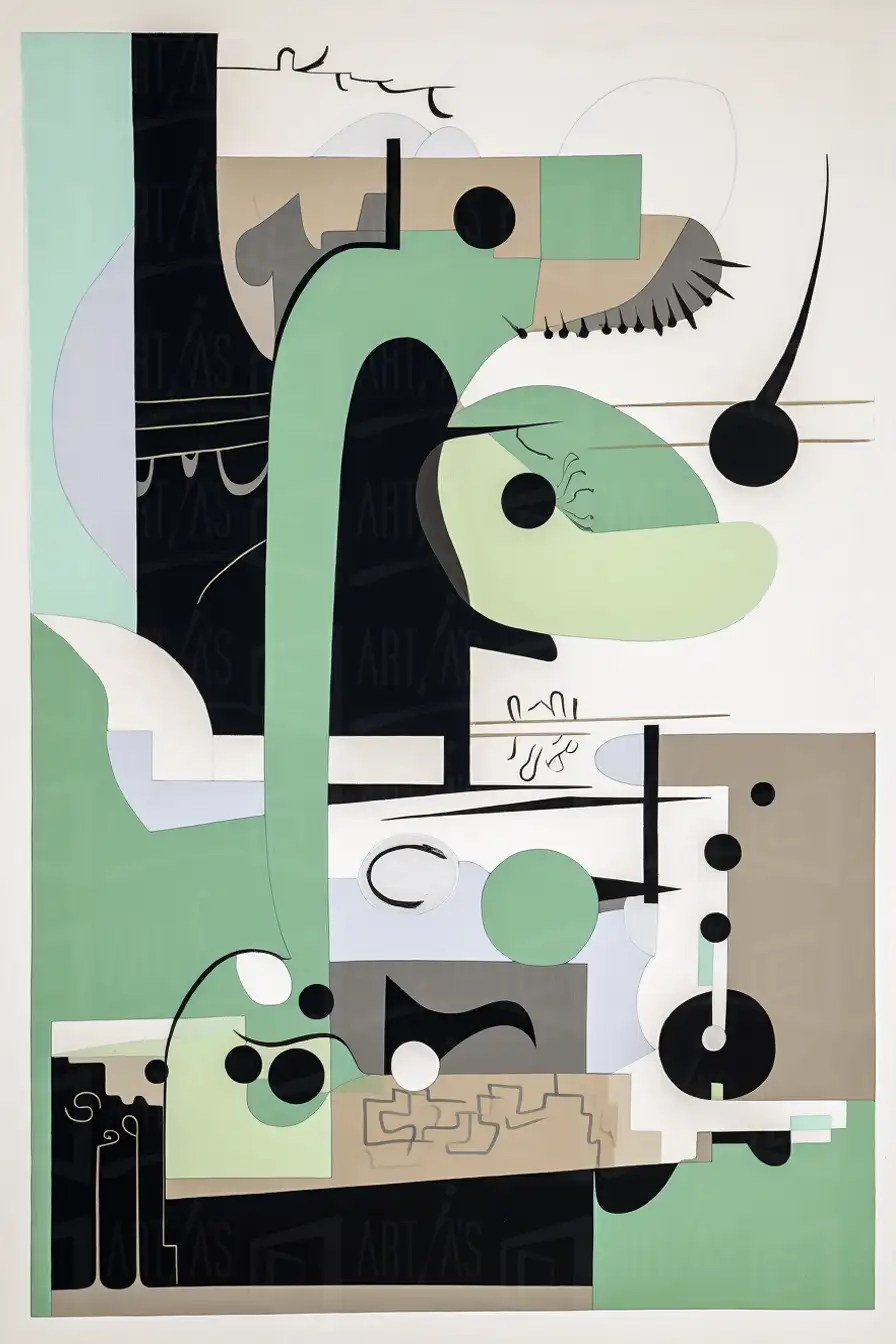 Obra abstracta que presenta una serie de formas geométricas en una disposición dinámica. Los colores predominantes incluyen tonos de verde, negro y beige, creando un contraste visual interesante. La obra juega con la organización de los elementos, generando una sensación de movimiento y profundidad. Esta representación se enmarca dentro del arte contemporáneo, destacando la interacción entre las formas y los espacios vacíos.