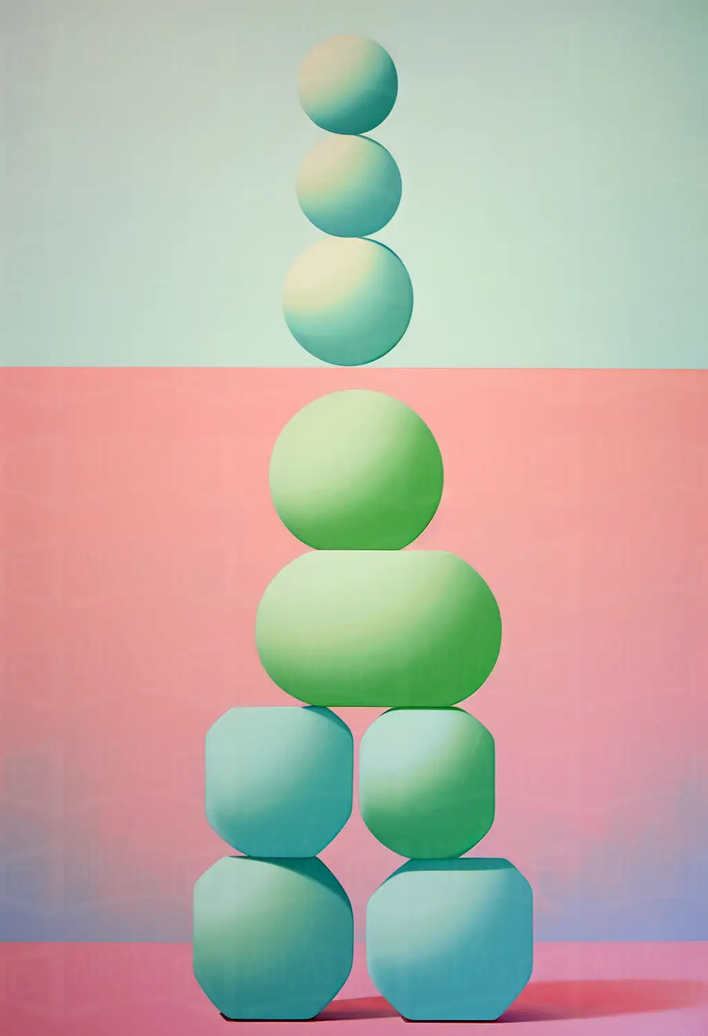 Obra abstracta que presenta una serie de formas geométricas apiladas, incluyendo esferas y bloques, en tonos de verde y azul. El fondo rosa contrasta con las formas, creando una sensación de equilibrio y armonía. La disposición vertical de las formas sugiere estabilidad y orden, mientras que la suavidad de los colores aporta una atmósfera tranquila. Esta obra es un ejemplo de la exploración de la forma y el color en el arte contemporáneo.