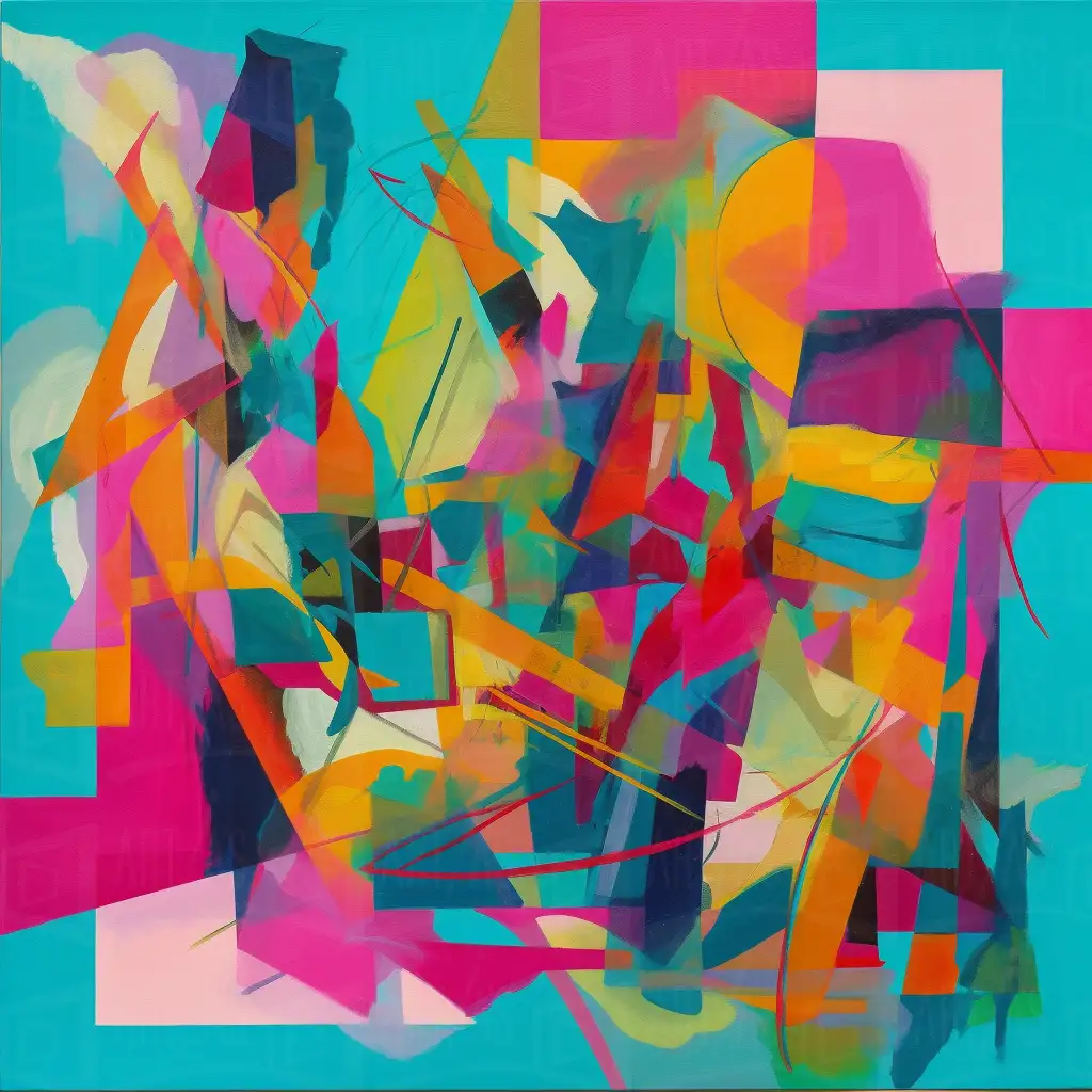 Obra abstracta que presenta una variedad de formas geométricas y líneas dinámicas en una explosión de colores vibrantes. La interacción entre los tonos de azul, rosa, naranja y verde crea un efecto visual atractivo y enérgico. Esta pieza destaca por su composición no lineal, donde los elementos parecen fluir y entrelazarse, invitando al espectador a explorar la relación entre el color y la forma en un contexto contemporáneo.