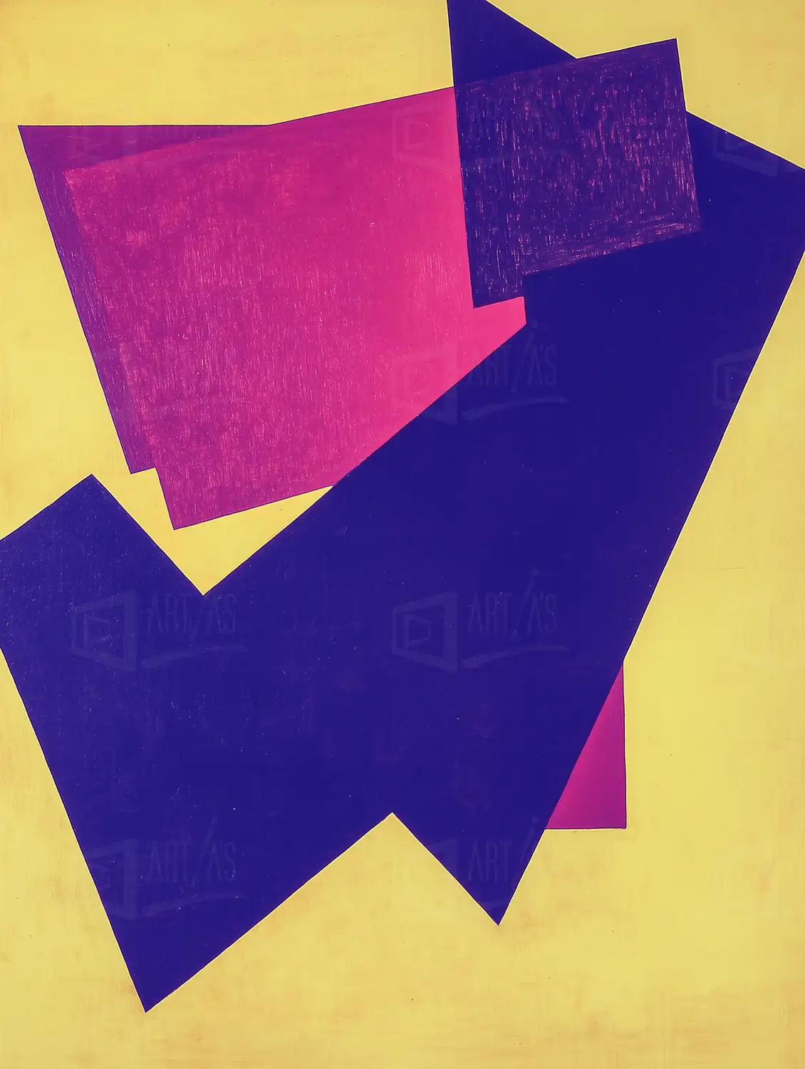Obra abstracta que presenta una serie de formas geométricas en colores vibrantes como el púrpura, el rosa y el amarillo. La disposición de las figuras crea un dinamismo visual, invitando al espectador a explorar la interacción entre los colores y las formas. Esta obra refleja las características del arte moderno, donde la simplificación de la forma y el uso del color son fundamentales para transmitir emociones y conceptos. La técnica utilizada permite una superficie lisa que resalta la intensidad de los colores, típica de las obras creadas en el siglo XX.