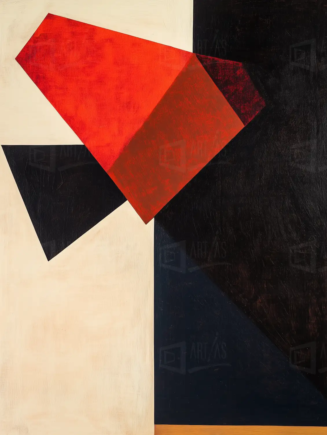 Obra abstracta que presenta una composición de formas geométricas en colores rojo, negro y blanco. La disposición de los elementos crea un contraste visual fuerte, destacando la interacción entre las formas y los colores. La obra refleja influencias del arte moderno, utilizando una paleta limitada para generar un impacto visual. La técnica empleada sugiere un enfoque contemporáneo, característico de movimientos artísticos del siglo XX.