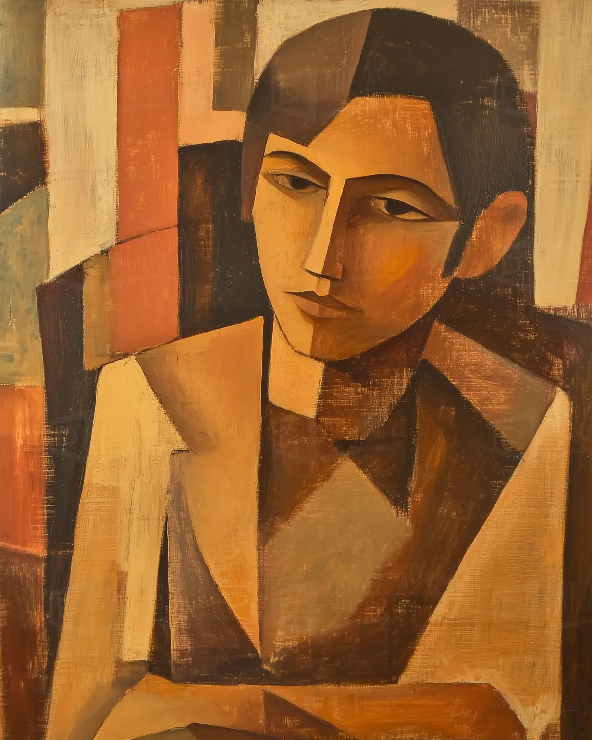 Retrato de una figura humana representada con un estilo geométrico, utilizando una paleta de colores terrosos que incluye tonos marrones y ocres. La obra refleja influencias del cubismo, con una disposición angular de las facciones y un enfoque en la simplificación de formas. La expresión del sujeto es introspectiva, lo que invita a la reflexión sobre la identidad y la forma. Esta obra se sitúa en el contexto del arte moderno, destacando la búsqueda de nuevas formas de representación en el siglo XX.