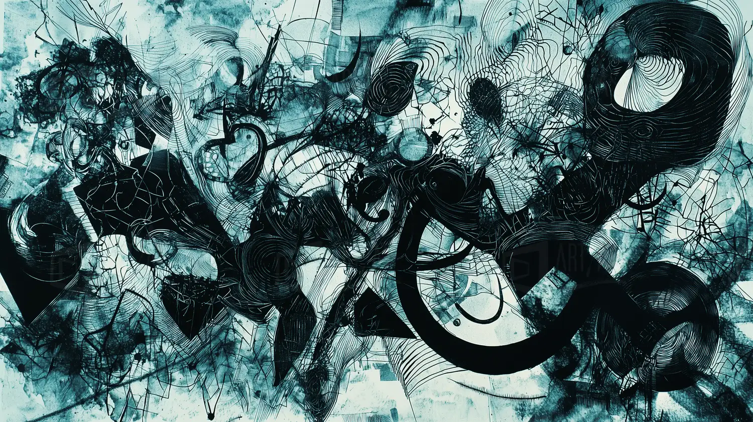 Obra abstracta que presenta una compleja interacción de formas orgánicas y líneas fluidas en una paleta de azules y negros. La disposición de los elementos crea un sentido de movimiento y dinamismo, invitando al espectador a explorar las conexiones entre las formas. La técnica utilizada sugiere un enfoque contemporáneo, característico de las obras del siglo XXI, donde la abstracción se convierte en un medio para expresar emociones y conceptos complejos.