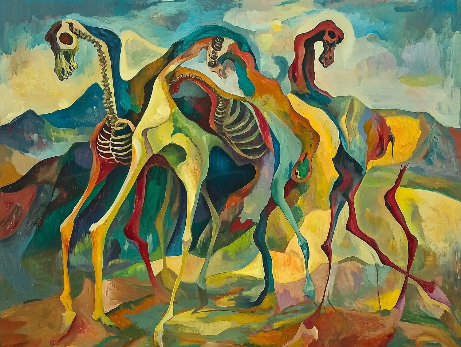 Obra que presenta una interpretación abstracta de caballos esqueléticos, con un uso vibrante de colores que sugiere movimiento y dinamismo. Las figuras se entrelazan en una composición fluida, destacando la estructura ósea de los animales. La paleta de colores incluye tonos cálidos y fríos, creando un contraste visual que atrae la atención. Esta obra refleja influencias del expresionismo, capturando la esencia de la vida y la muerte a través de la representación de estos seres en un entorno surrealista.
