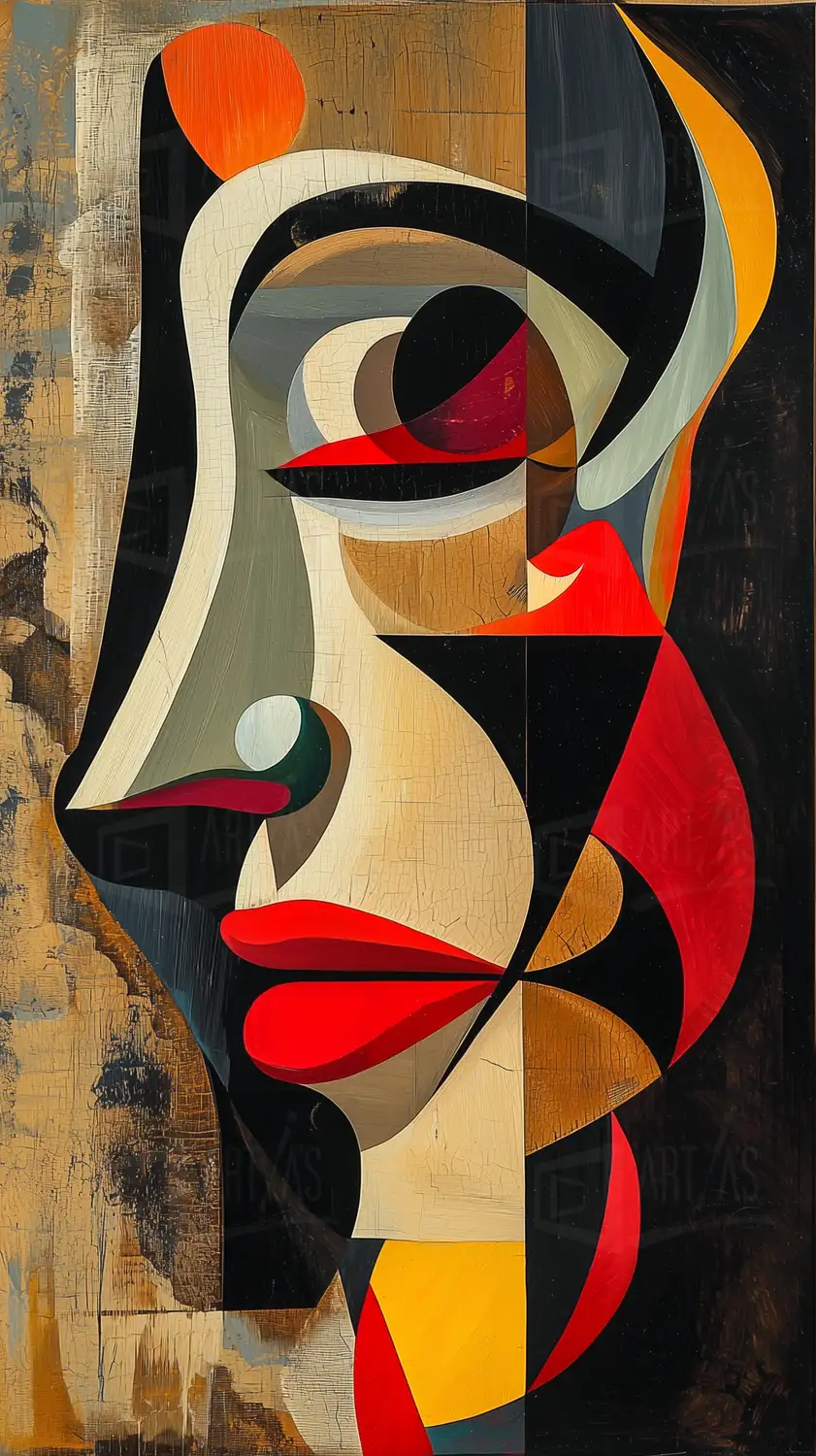 Retrato abstracto que representa una figura humana a través de formas geométricas y colores contrastantes. La obra utiliza una paleta de tonos cálidos y fríos, creando un diálogo visual entre las diferentes secciones del rostro. La composición destaca por su uso de líneas curvas y ángulos, lo que aporta dinamismo y movimiento. Esta obra refleja influencias del arte moderno, con un enfoque en la simplificación de las formas y la exploración de la identidad.